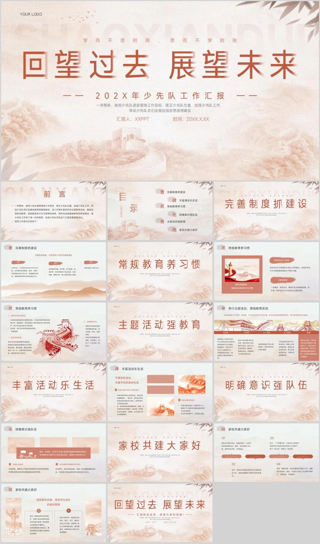 SHAOXIANDUI回望过去展望未来YOUR LOGO学而不思则罔,思而不学则殆一学期来,我校少先队紧紧围绕工作目标,摆正少先队位置,加强少先队工作,带动少先队员们全面加强思想道德建设—— 202X年少先队工作汇报 ——汇报人:XXPPT时间:20XX.X.XX中国风,2157,