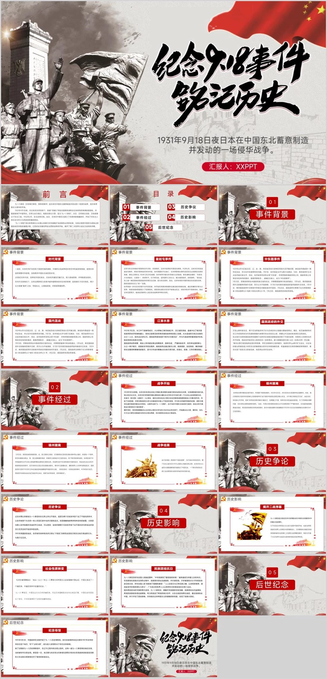 汇报人:XXPPT1931年9月18日夜日本在中国东北蓄意制造并发动的一场侵华战争。九一八事变,