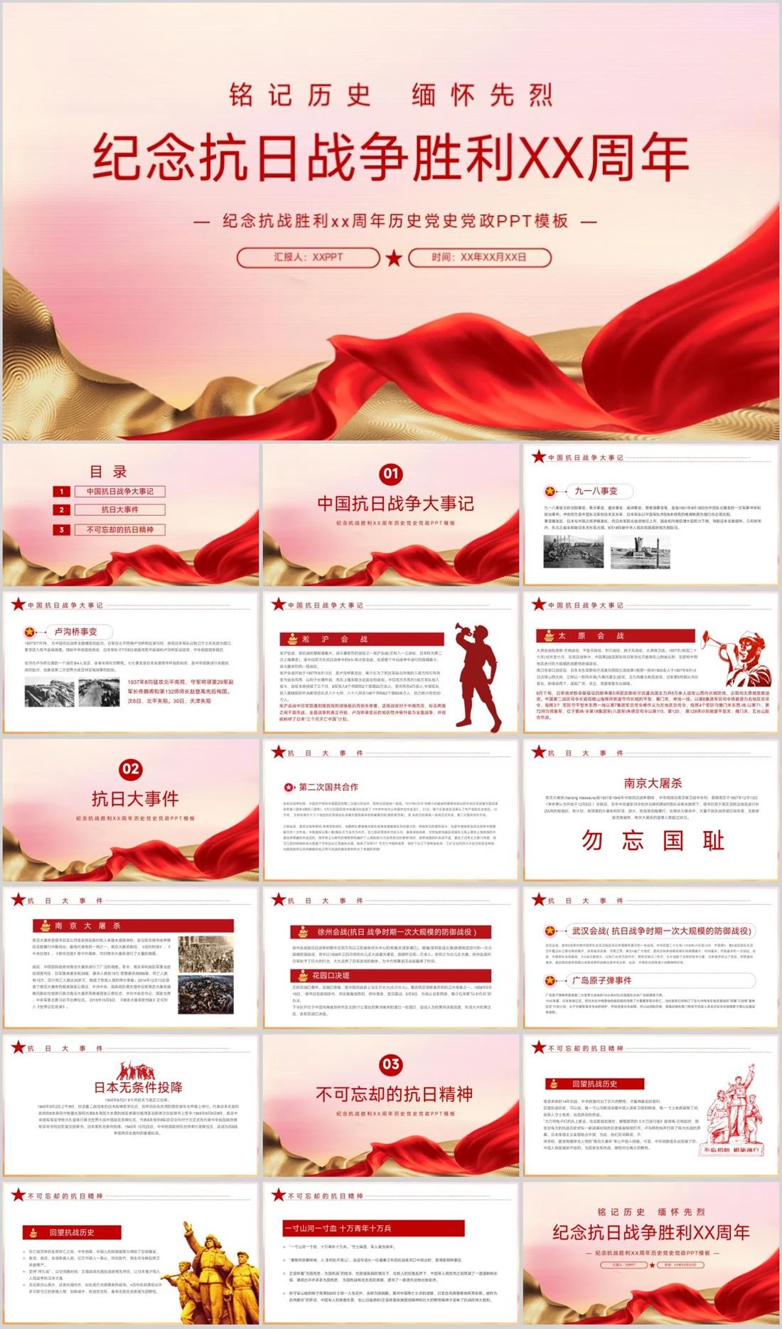 铭记历史 缅怀先烈纪念抗日战争胜利XX周年— 纪念抗战胜利xx周年历史党史党政PPT模板 —汇报人:XXPPT 时间:XX年XX月XX日九一八事变,1577,