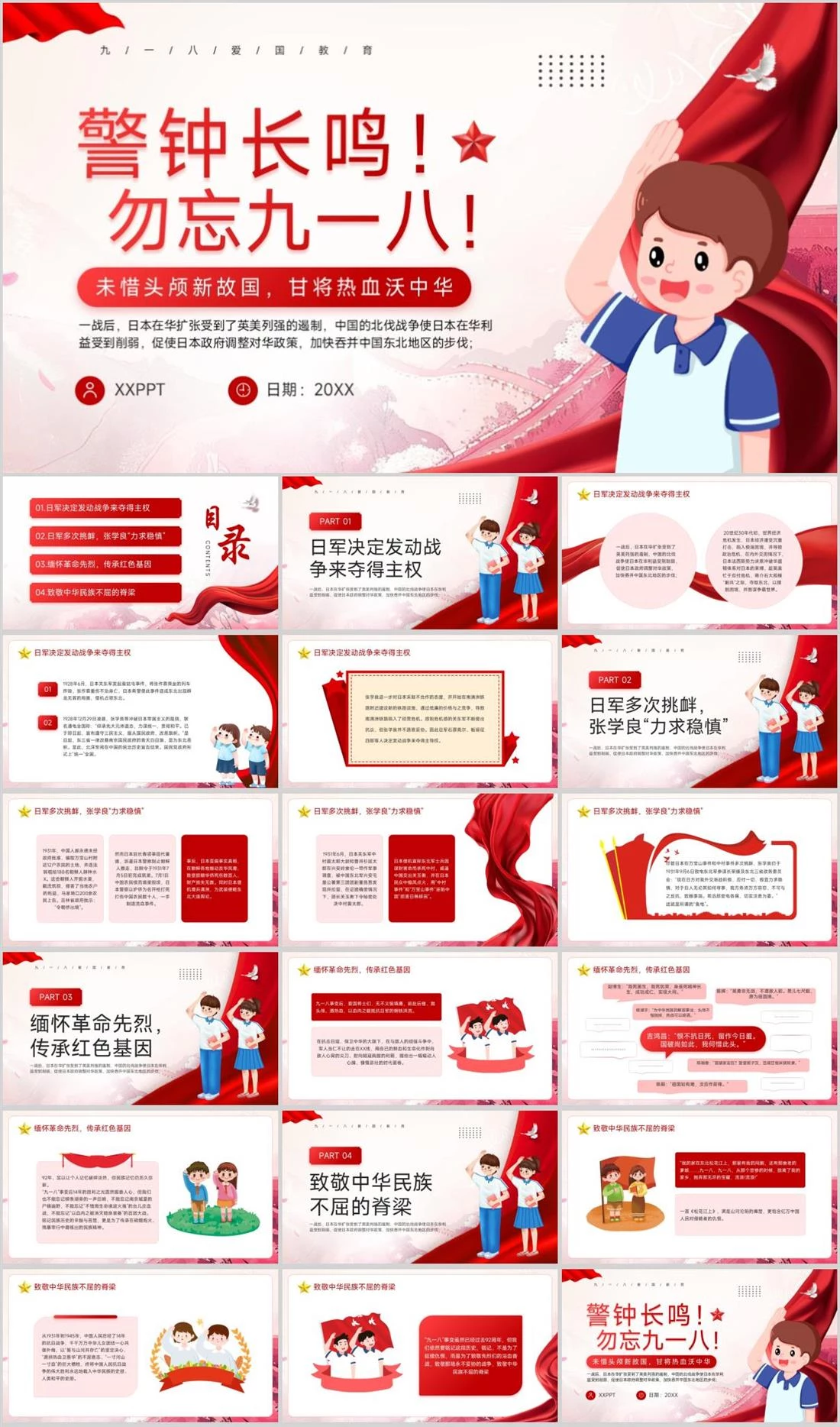 九/一/八/爱/国/教/育一战后,日本在华扩张受到了英美列强的遏制,中国的北伐战争使日本在华利益受到削弱,促使日本政府调整对华政策,加快吞并中国东北地区的步伐;XXPPT日期:20XX未惜头颅新故国,甘将热血沃中华警钟长鸣!勿忘九一八!九一八事变,1620,