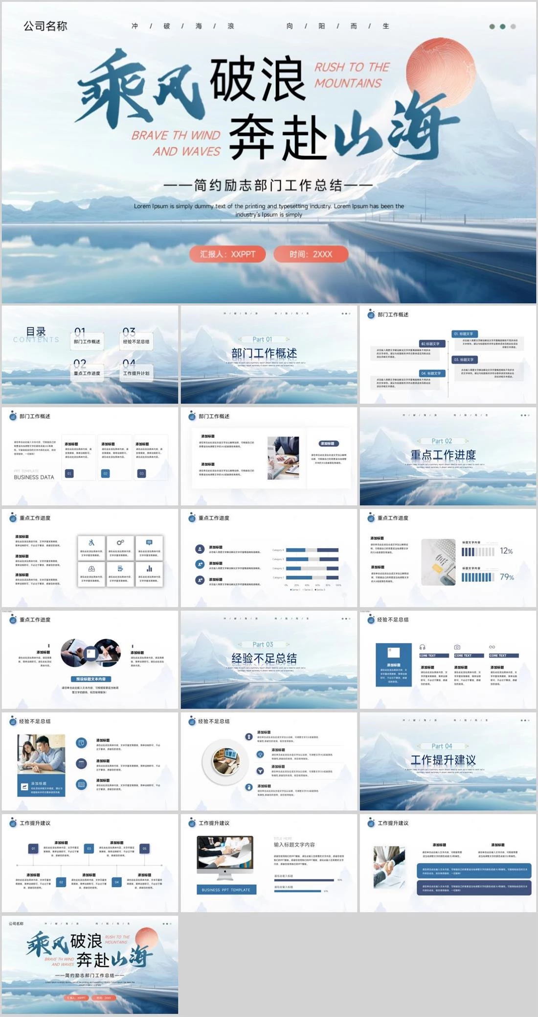——简约励志部门工作总结——RUSH TO THE MOUNTAINS奔赴破浪BRAVE TH WIND AND WAVES汇报人:XXPPT时间:2XXXLorem Ipsum is simply dummy text of the printing and typesetting indust商务汇报,1349,