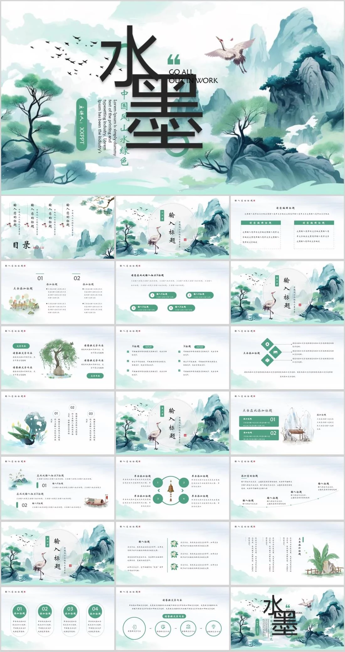 墨水GO ALL OUT IN WORK中国风山水绿色Lorem Ipsum is simply dummy text of the printing and typesetting industry. Lorem Ipsum has been the industry's主讲人:XXPPT 商务汇报,1453,