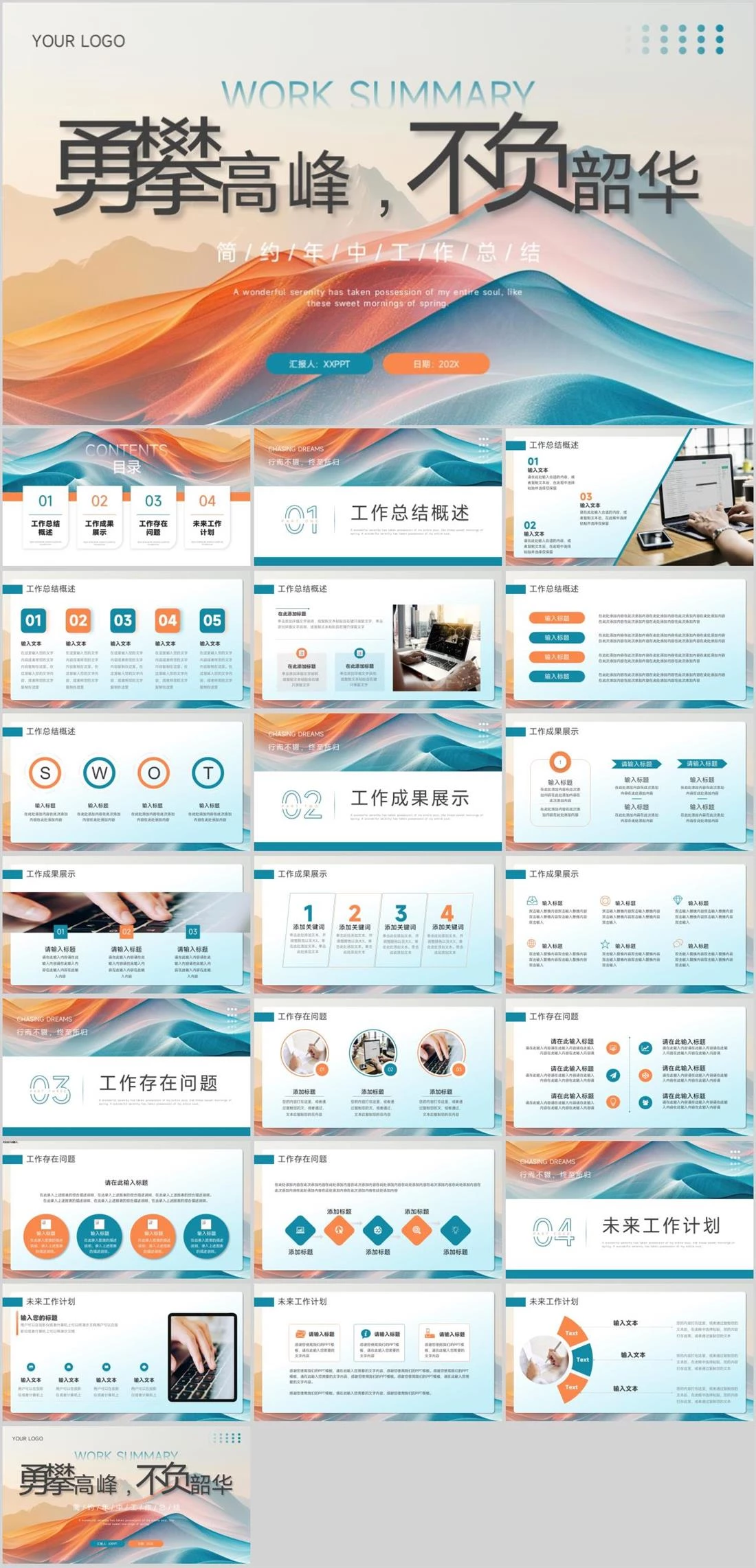 A wonderful serenity has taken possession of my entire soul, like these sweet mornings of spring.简/约/年/中/工/作/总/结日期:202X汇报人:XXPPTYOUR LOGO勇攀高峰,不负韶华WOR商务汇报,1675,