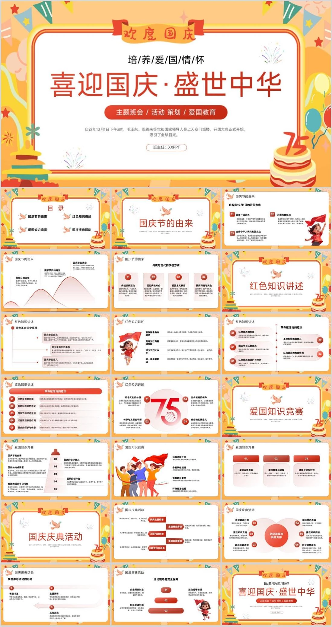 喜迎国庆·盛世中华主题班会 / 活动 策划 / 爱国教育自改年10月1日下午3时,毛泽东、周恩来等党和国家领导人登上天安门城楼,开国大典正式开始,吸引了全球目光。培/养/爱/国/情/怀班主任:XXPPT国庆节,2701,