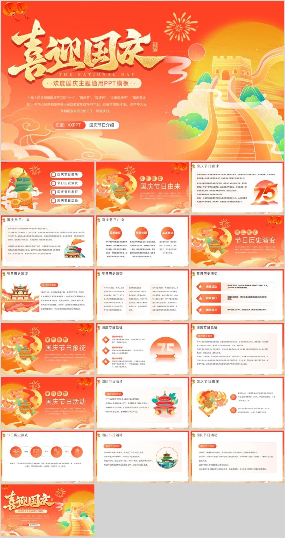 ··欢度国庆主题通用PPT模板··中华人民共和国国庆节又称“十一”、“国庆节”、“国庆日”、“中国国庆节”、“国庆黄金周”。中华人民共和国中央人民政府宣布自1949年起,以每年的10月1日,即中华人民共和国宣告成立的日子,即国庆日。汇报:XXPPT国庆节日介绍国庆节,2727,