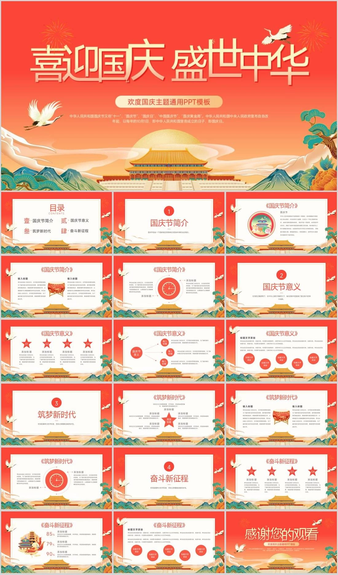 喜迎国庆盛世中华欢度国庆主题通用PPT模板中华人民共和国国庆节又称“十一”、“国庆节”、“国庆日”、“中国国庆节”、“国庆黄金周”。中华人民共和国中央人民政府宣布自自改年起,以每年的10月1日,即中华人民共和国宣告成立的日子,即国庆日。国庆节,2770,