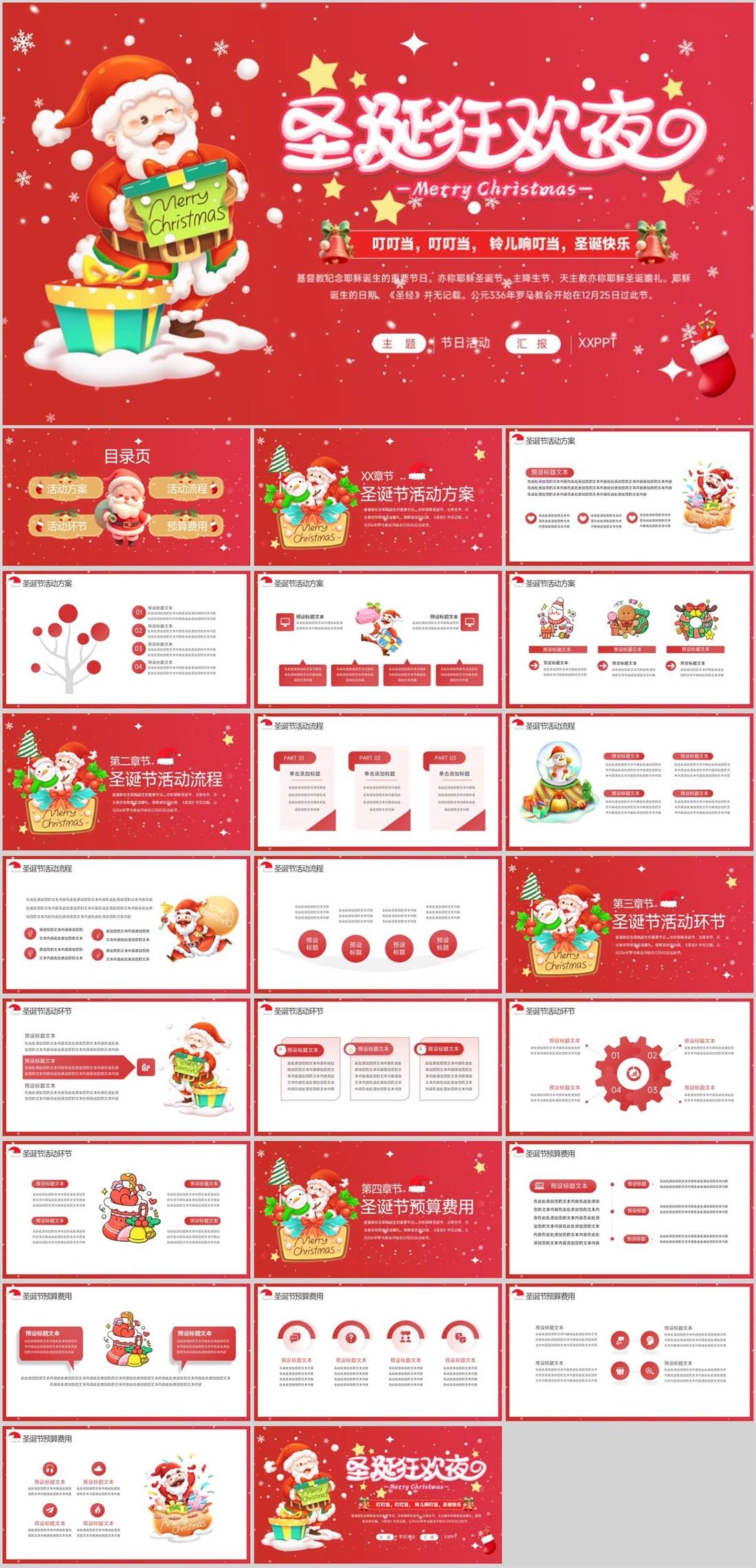 基督教纪念耶稣诞生的重要节日。亦称耶稣圣诞节、主降生节,天主教亦称耶稣圣诞瞻礼。耶稣诞生的日期,《圣经》并无记载。公元336年罗马教会开始在12月25日过此节。 叮叮当,叮叮当, 铃儿响叮当,圣诞快乐 节日活动XXPPT主题汇报圣诞狂欢夜,