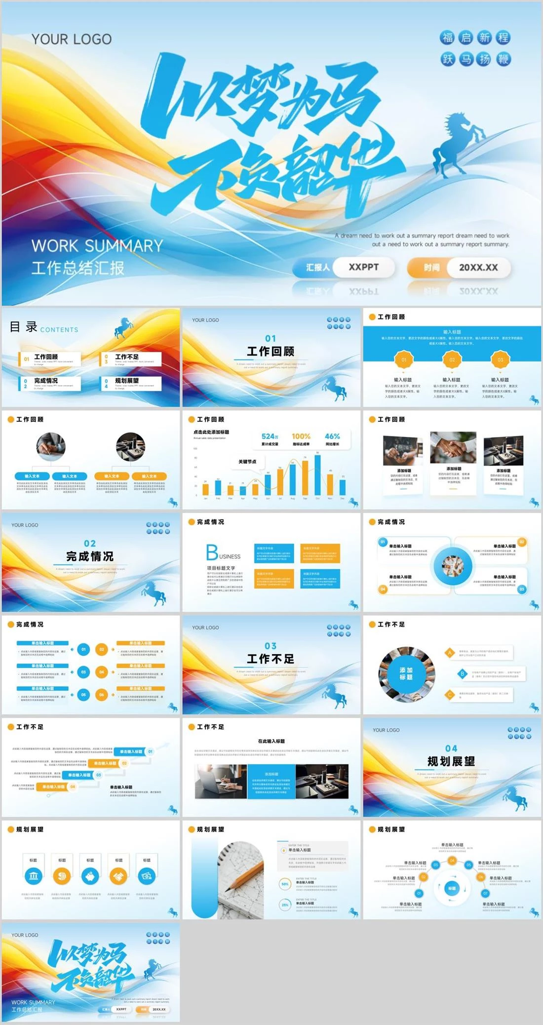 WORK SUMMARYYOUR LOGOA dream need to work out a summary report dream need to work out a need to work out a summary report summary. 汇报人XXPPT 时间2工作总结,2456,