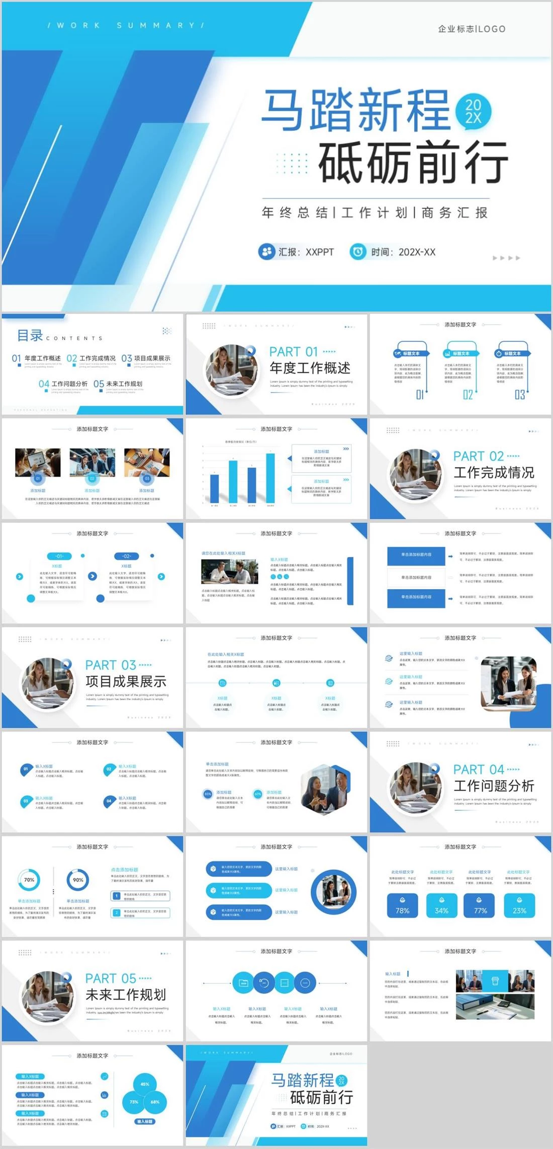 年终总结|工作计划|商务汇报汇报:XXPPT时间:202X-XX/WORK SUMMARY/企业标志|LOGO马踏新程砥砺前行202X工作总结,2540,