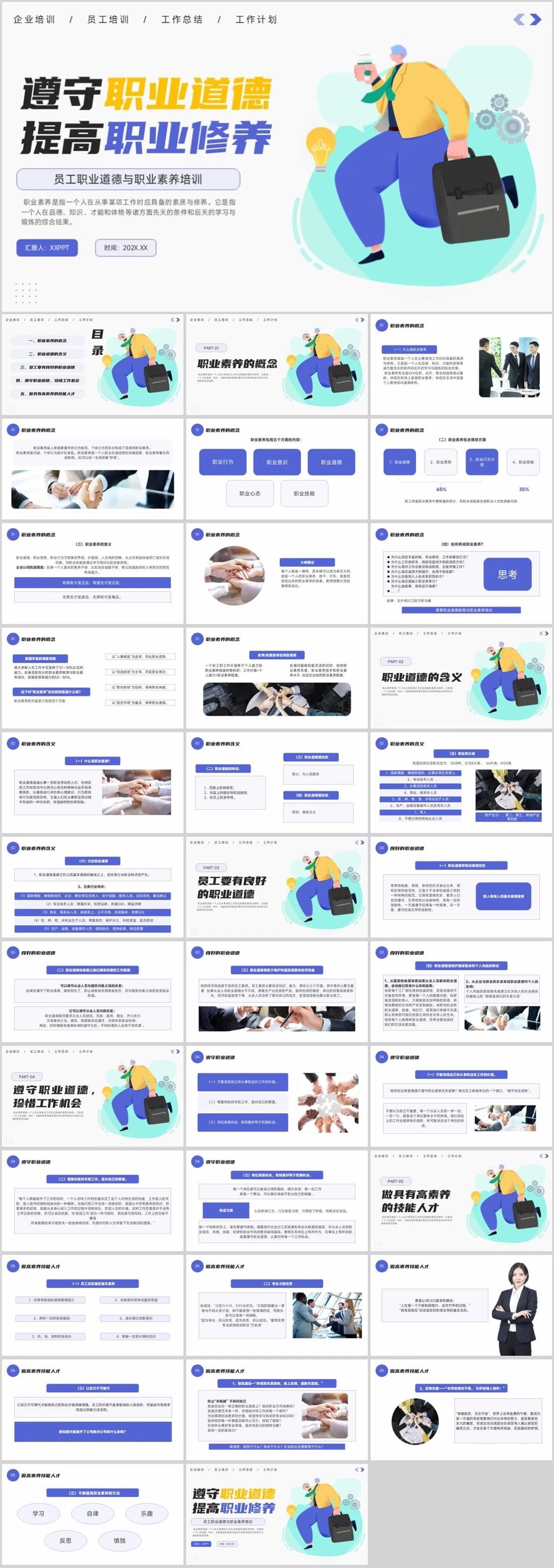 遵守职业道德提高职业修养企业培训 / 员工培训 / 工作总结 / 工作计划员工职业道德与职业素养培训 职业素养是指一个人在从事某项工作时应具备的素质与修养。它是指一个人在品德、知识、才能和体格等诸方面先天的条件和后天的学习与锻炼的综合结果。 汇报人:XXPPT 时间:202X.XX企业培训,428,