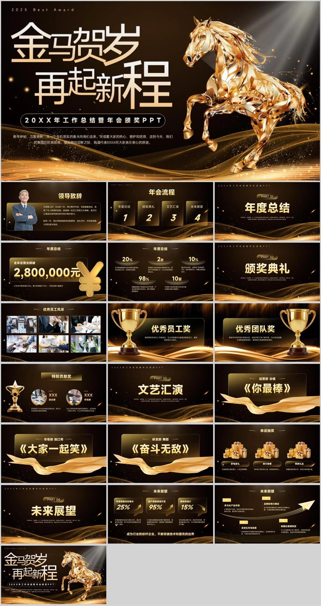 金马贺岁再起新程20XX年工作总结暨年会颁奖PPT新年伊始,万象更新,又一个生机勃发的春天向我们走来。凭借着大家的热心、爱护和培育,走到今天,我们的集团已初具规模。值此辞旧迎新之际,我谨代表XXXX向大家表示衷心的感谢。2025 Best Award公司年会,2440,