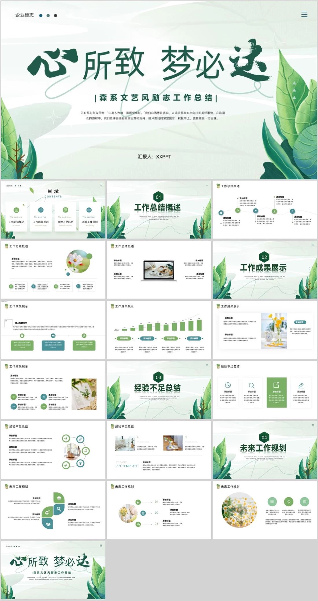 企业标志 |森系文艺风励志工作总结|所致必梦正如那句名言所说:“山高人为峰,海阔凭鱼跃。”我们应当勇往直前,去追求那些心中向往的美好事物。在这漫长的旅程中,我们也许会遇到重重困难和阻碍,但只要我们坚定信念、积极向上,便能克服一切困境。汇报人:XXPPT励志商务风,269,