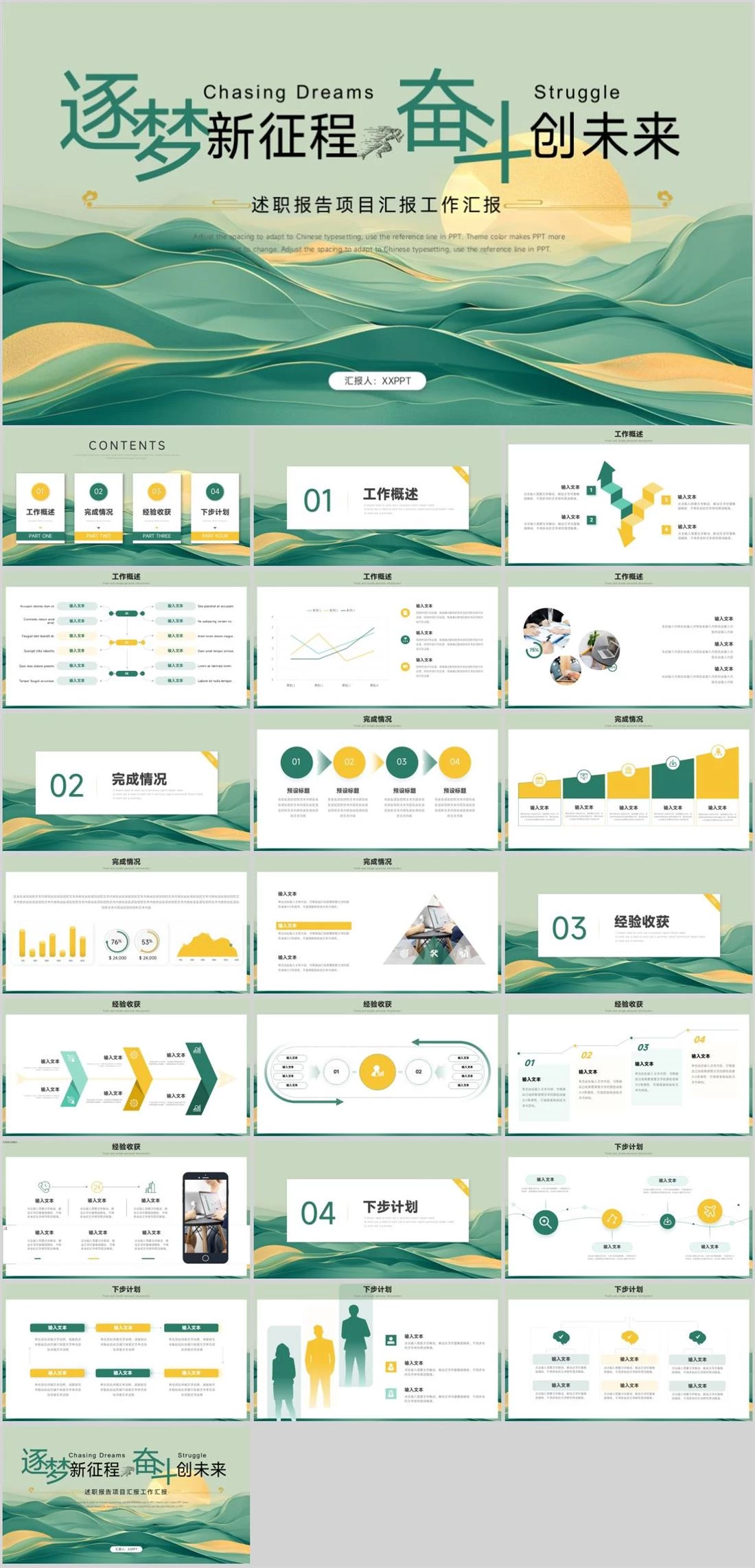 逐梦新征程奋斗创未来Chasing DreamsStruggle述职报告项目汇报工作汇报Adjust the spacing to adapt to Chinese typesetting, use the reference line in PPT. Theme color makes PPT 励志商务风,272,