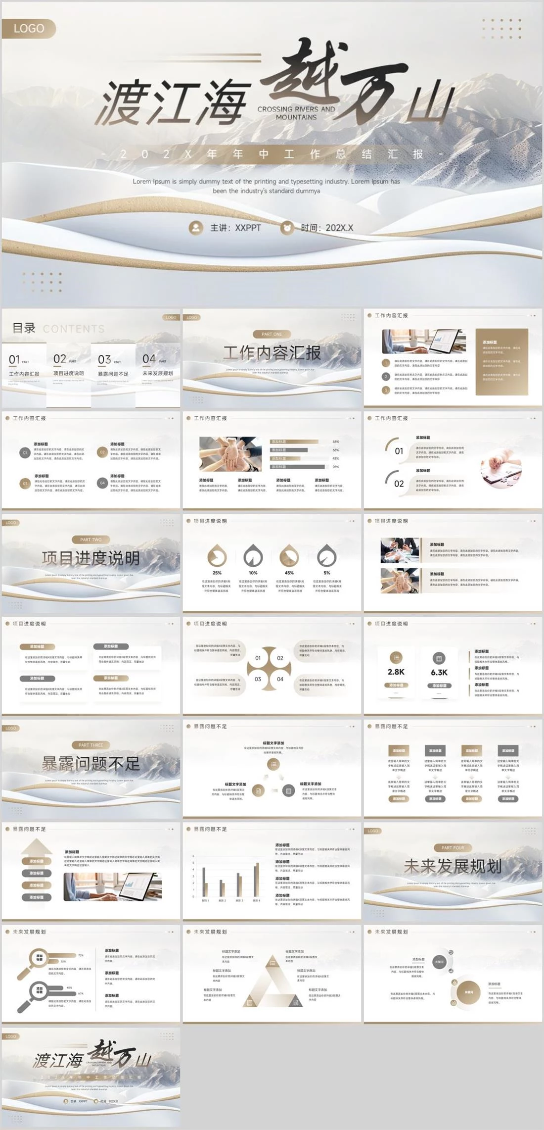 LOGO越万渡江海山CROSSING RIVERS AND MOUNTAINS-202X年年中工作总结汇报-Lorem Ipsum is simply dummy text of the printing and typesetting industry. Lorem Ipsum has been励志商务风,915,
