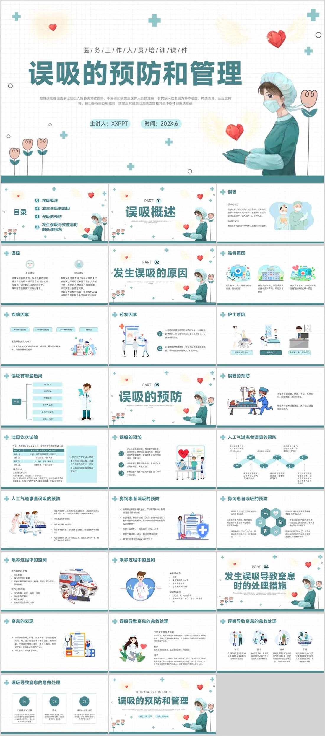 误吸的预防和管理医/务/工/作/人/员/培/训/课/件隐性误吸往往直到出现吸入性肺炎才被觉察,不易引起家属及医护人员的注意,有的病人仅表现为精神萎靡,神志淡漠,反应迟钝等,原因是吞咽反射减弱,咳嗽反射减弱以及脑血管和其他中枢神经系统疾病主讲人:XXPPT 时间:202X.6医疗护理,1716,