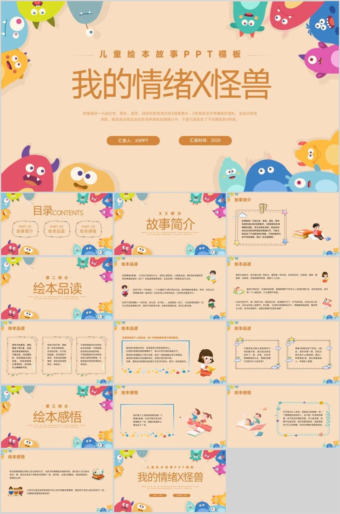 儿童绘本故事PPT模板我的情绪X怪兽故事围绕一只由红色、黄色、蓝色、绿色和黑色混合的X怪兽展开。X怪兽感觉非常糟糕和混乱,就去向朋友求助。朋友告诉他应该先把各种颜色的情绪分开,于是它就变成了不同颜色的X怪兽。汇报人:XXPPT汇报时间:202X情绪管理,1047,