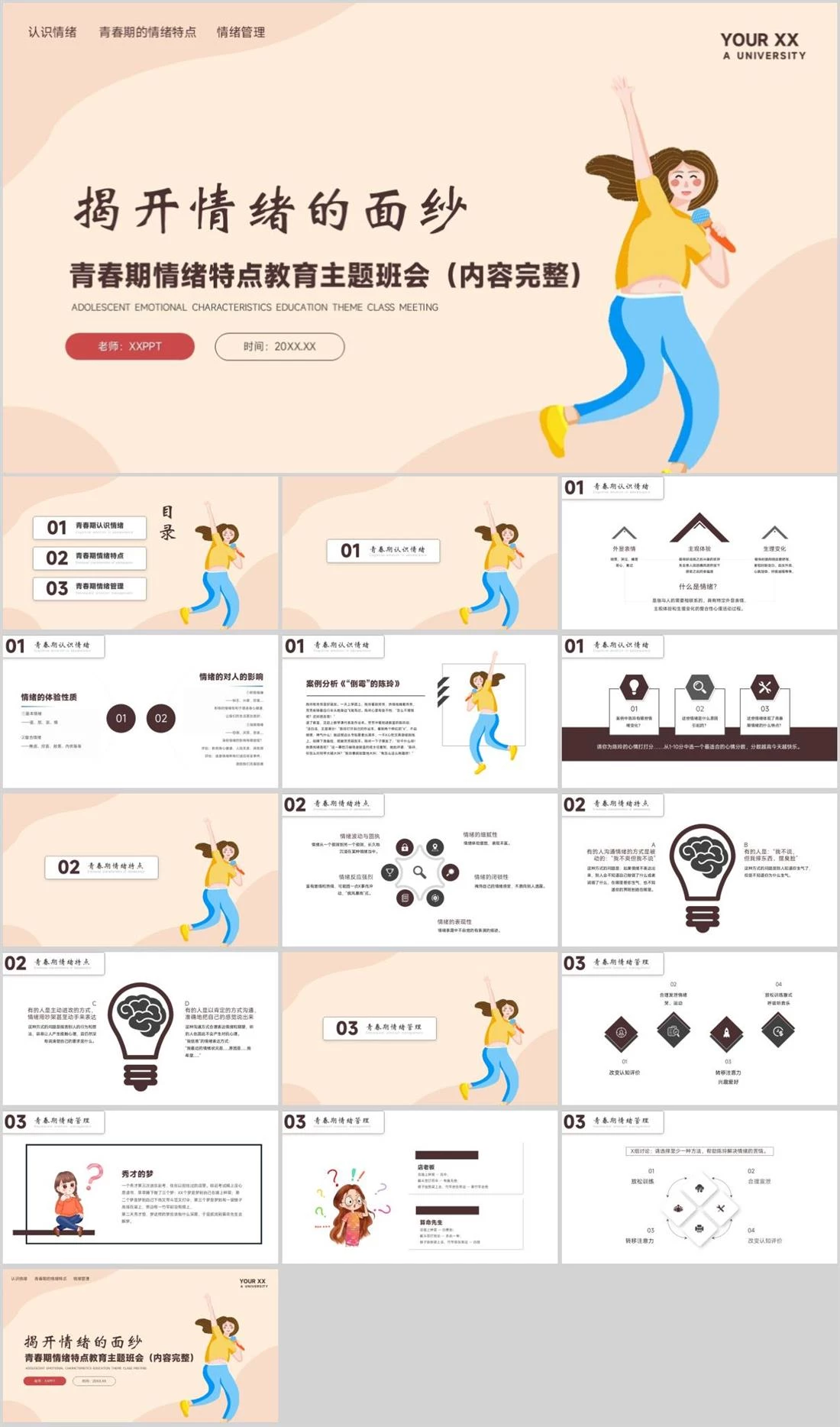 揭开情绪的面纱青春期情绪特点教育主题班会(内容完整)ADOLESCENT EMOTIONAL CHARACTERISTICS EDUCATION THEME CLASS MEETING老师:XXPPT时间:20XX.XXYOUR XXA UNIVERSITY认识情绪青春期的情绪特点情绪管理情绪管理,1059,