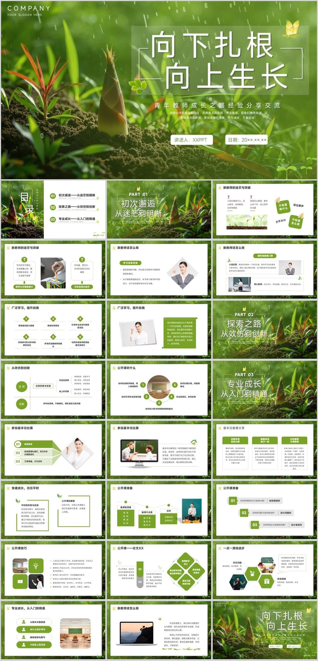 COMPANYYOUR SLOGAN HERE向下扎根向上生长青年教师成长之路经验分享交流保持心中的信念和向往,无惧前方的风雨,勇往直前。愿我们携手共进,以更加坚定的步伐、更加迅捷的速度,共同成长,不断前进!讲述人:XXPPT日期:20××.××.××教师经验分享,