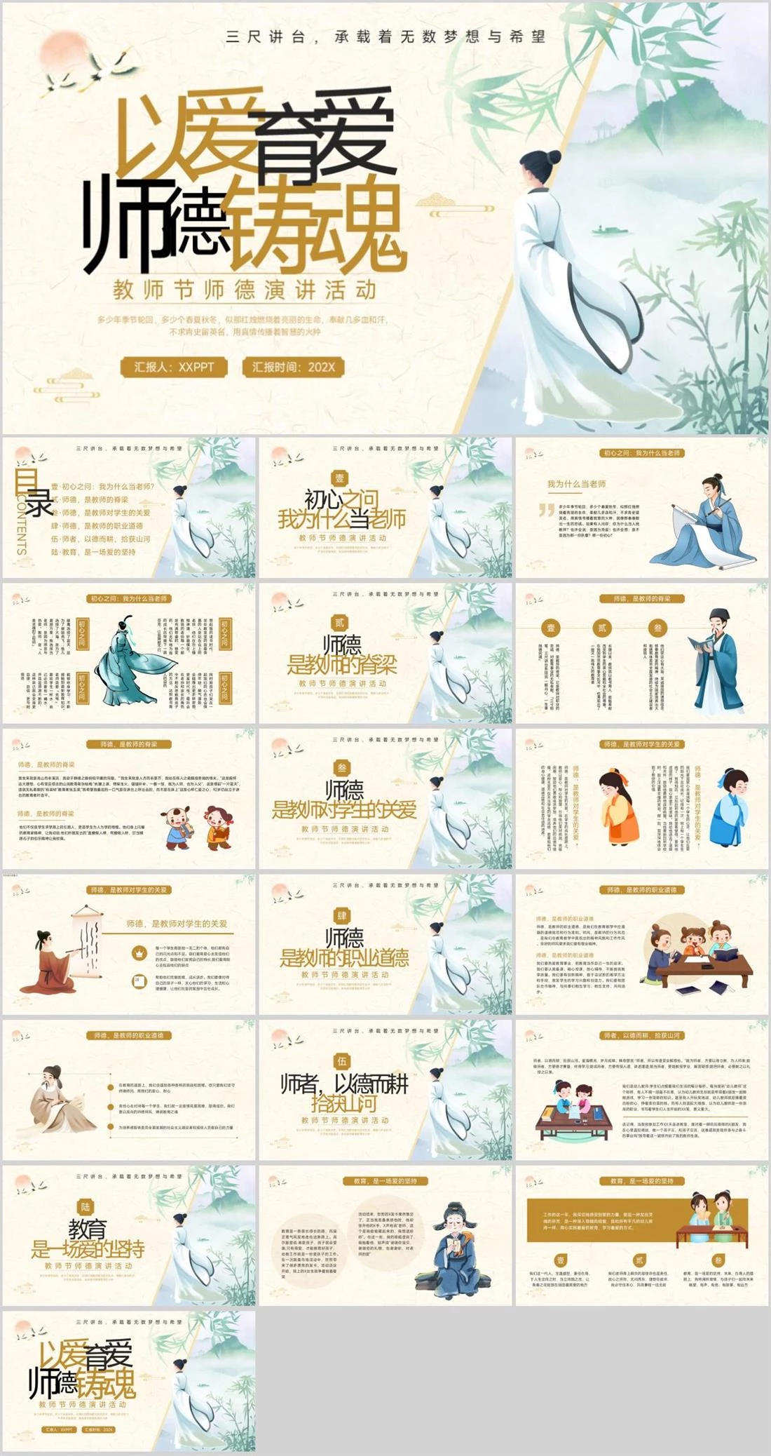 以爱育爱师德铸魂三尺讲台,承载着无数梦想与希望教师节师德演讲活动多少年季节轮回,多少个春夏秋冬,似那红烛燃烧着亮丽的生命,奉献几多血和汗,不求青史留英名,用真情传播着智慧的火种汇报人:XXPPT汇报时间:202X教师节,