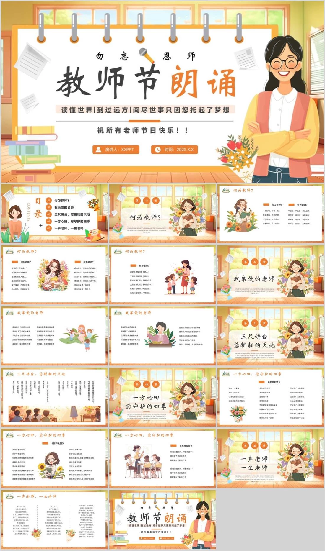 教师节朗诵演讲人:XXPPT时间:202X.X.X勿忘 恩师祝所有老师节日快乐!!读懂世界|到过远方|阅尽世事只因您托起了梦想教师节,1594,