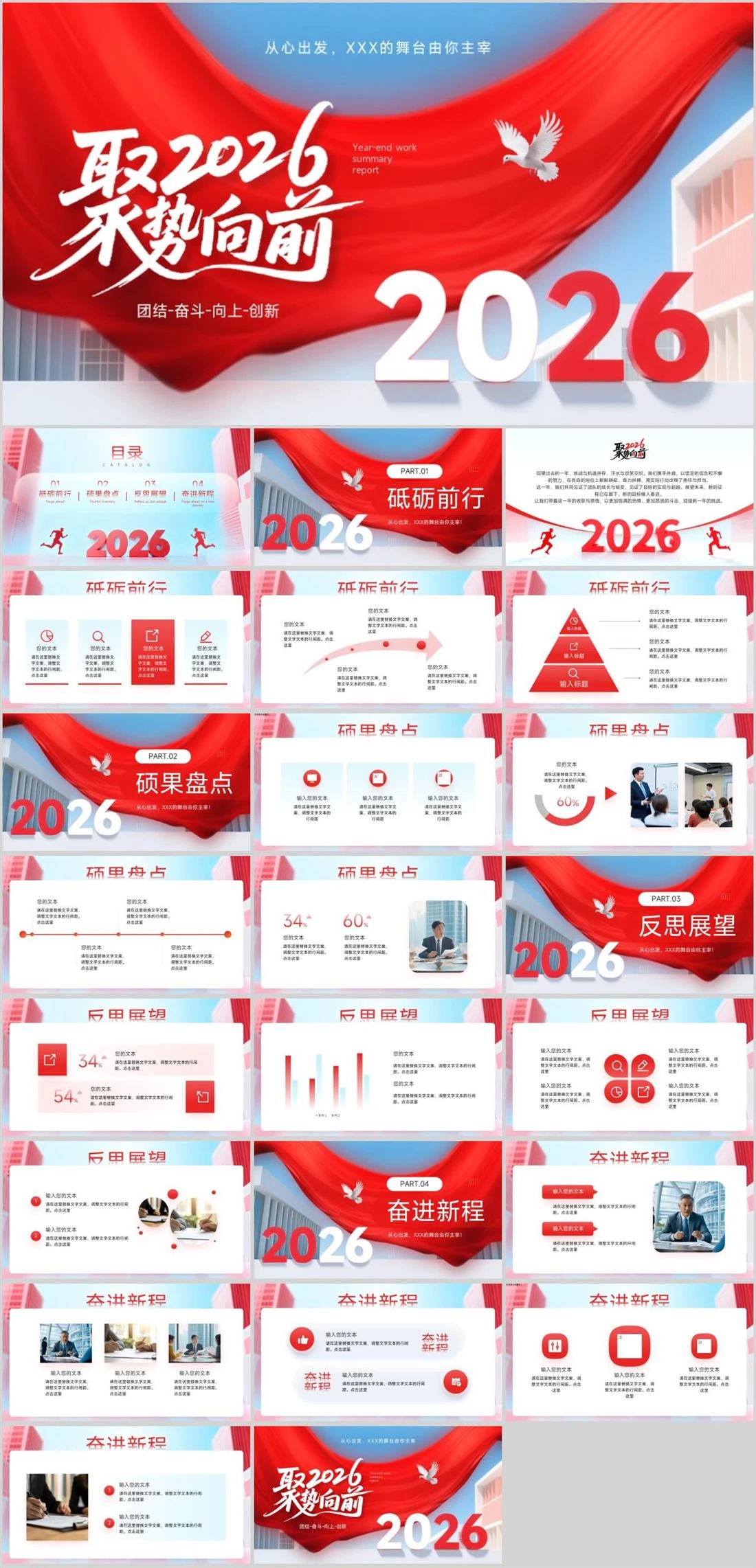 Year-end work summary report从心出发,XXX的舞台由你主宰团结-奋斗-向上-创新新年主题,1930,