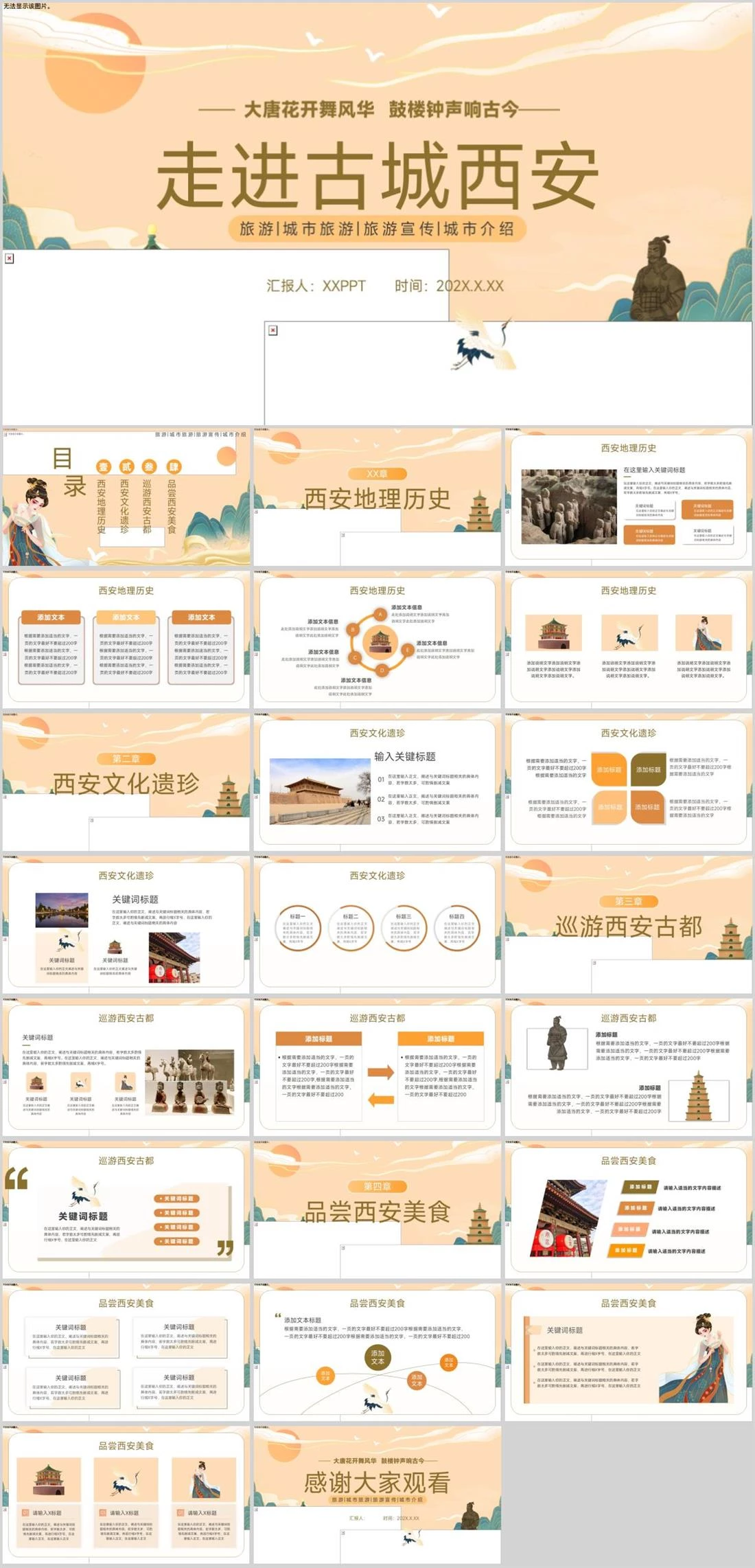 走进古城西安旅游|城市旅游|旅游宣传|城市介绍汇报人:XXPPT时间:202X.X.XX大唐花开舞风华 鼓楼钟声响古今旅行画册,176,