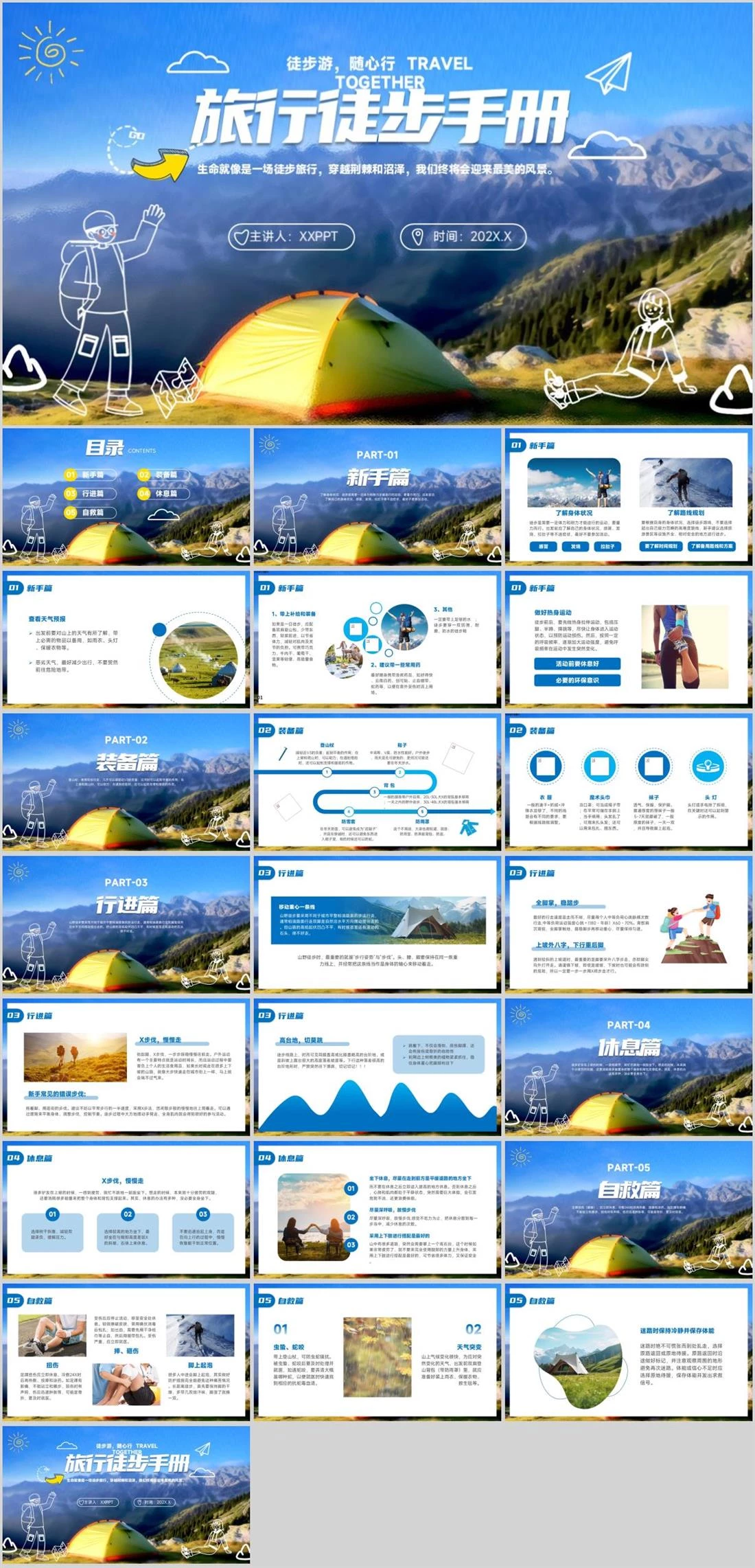主讲人:XXPPT时间:202X.X 旅行徒步手册GO生命就像是一场徒步旅行,穿越荆棘和沼泽,我们终将会迎来最美的风景。徒步游,随心行 TRAVEL TOGETHER旅行画册,199,