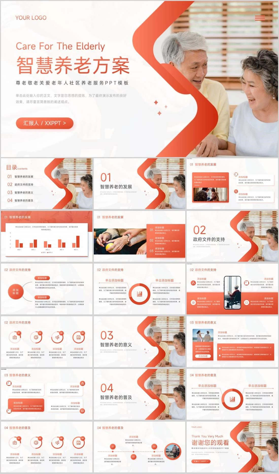 智慧养老方案单击此处输入你的正文,文字是您思想的提炼,为了最终演示发布的良好效果,请尽量言简意赅的阐述观点。Care For The Elderly尊老敬老关爱老年人社区养老服务PPT模板汇报人 / XXPPT >YOUR LOGO智慧养老,