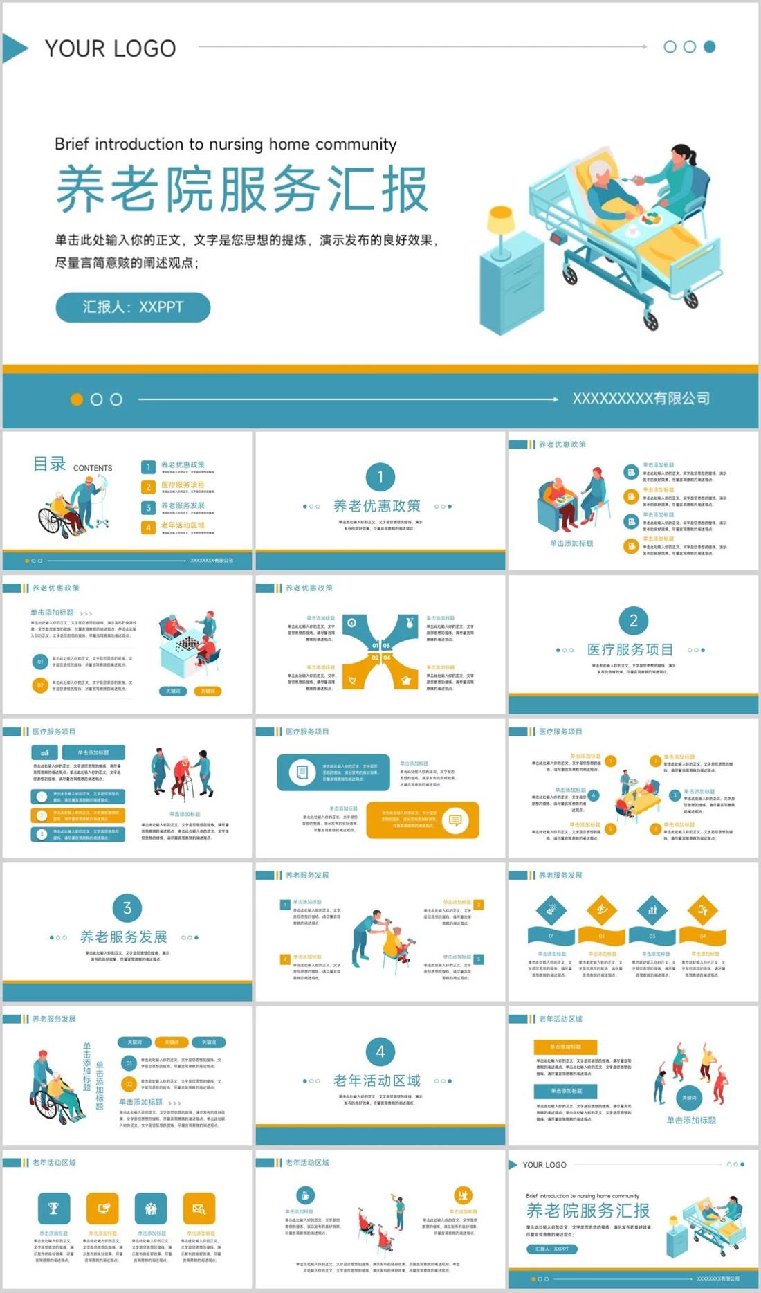 养老院服务汇报单击此处输入你的正文,文字是您思想的提炼,演示发布的良好效果,尽量言简意赅的阐述观点;YOUR LOGOBrief introduction to nursing home community汇报人:XXPPTXXXXXXXXX有限公司智慧养老,526,
