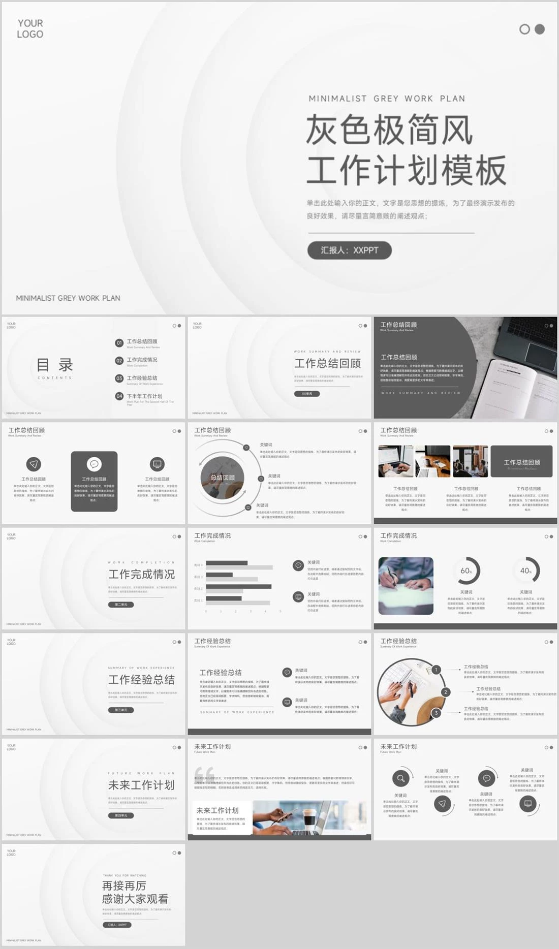 YOURLOGO灰色极简风工作计划模板单击此处输入你的正文,文字是您思想的提炼,为了最终演示发布的良好效果,请尽量言简意赅的阐述观点;MINIMALIST GREY WORK PLAN汇报人:XXPPTMINIMALIST GREY WORK PLAN极简商务,2345,