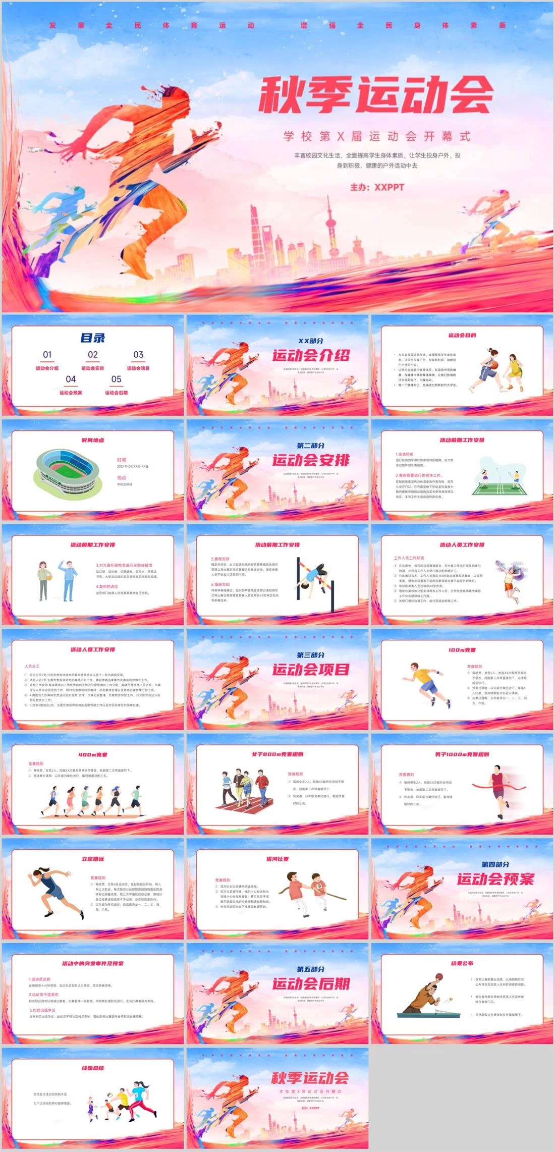 秋季运动会学校第X届运动会开幕式丰富校园文化生活,全面提高学生身体素质,让学生投身户外,投身到积极、健康的户外活动中去主办:XXPPT发展全民体育运动 增强全民身体素质校园活动,490,