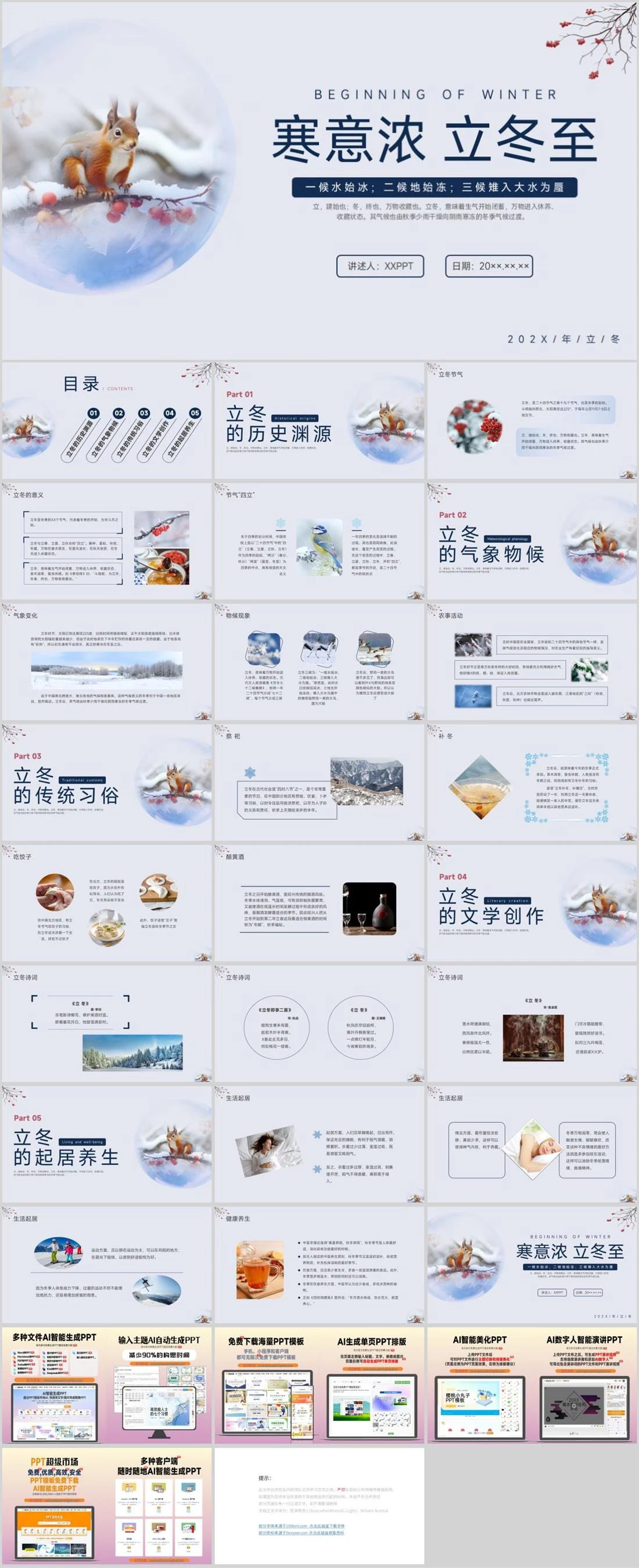 寒意浓立冬至BEGINNING OF WINTER一候水始冰;二候地始冻;三候雉入大水为蜃立,建始也;冬,终也,万物收藏也。立冬,意味着生气开始闭蓄,万物进入休养、收藏状态。其气候也由秋季少雨干燥向阴雨寒冻的冬季气候过渡。讲述人:XXPPT日期:20××.××.××202X/年/立/冬立冬节气,1193,