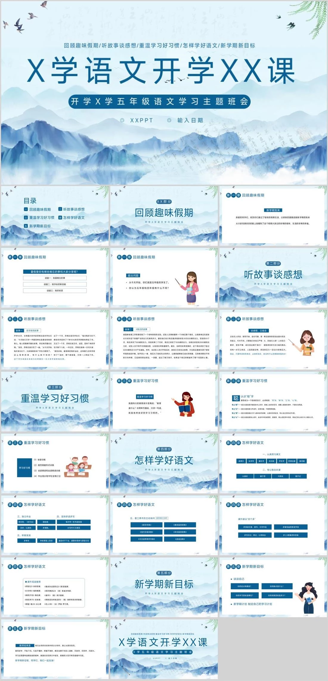 开学X学五年级语文学习主题班会X学语文开学XX课◎ XXPPT ◎ 输入日期回顾趣味假期/听故事谈感想/重温学习好习惯/怎样学好语文/新学期新目标开学主题,755,