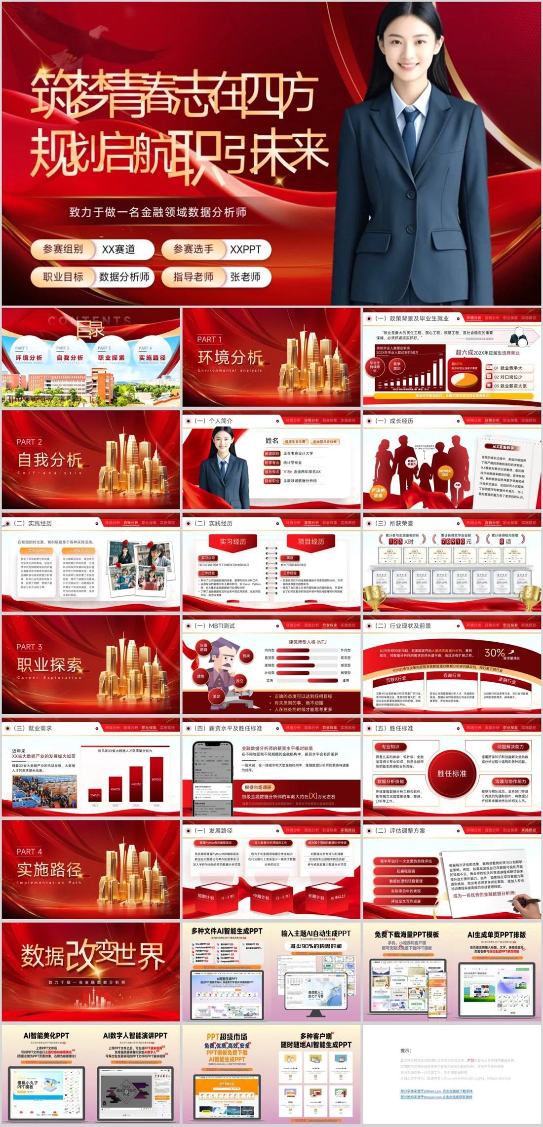 致力于做一名金融领域数据分析师参赛组别XX赛道参赛选手XXPPT职业目标数据分析师指导老师张老师筑梦青春志在四方规划启航职引未来职业规划,2119,