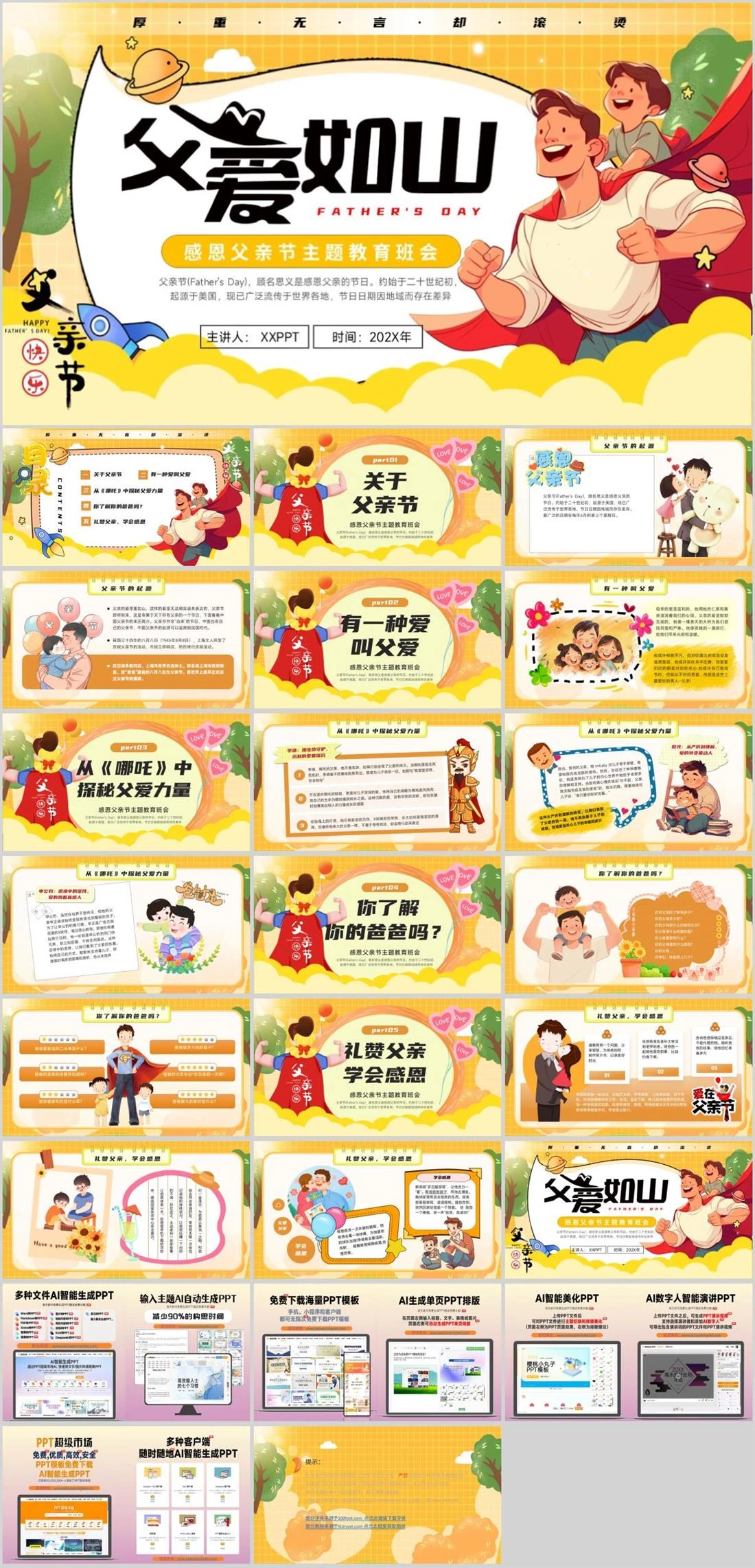 父亲节(Father's Day),顾名思义是感恩父亲的节日。约始于二十世纪初,起源于美国,现已广泛流传于世界各地,节日日期因地域而存在差异FATHER'S DAY感恩父亲节主题教育班会厚·重·无·言·却·滚·烫主讲人: XXPPT时间:202X年节日班会,111,