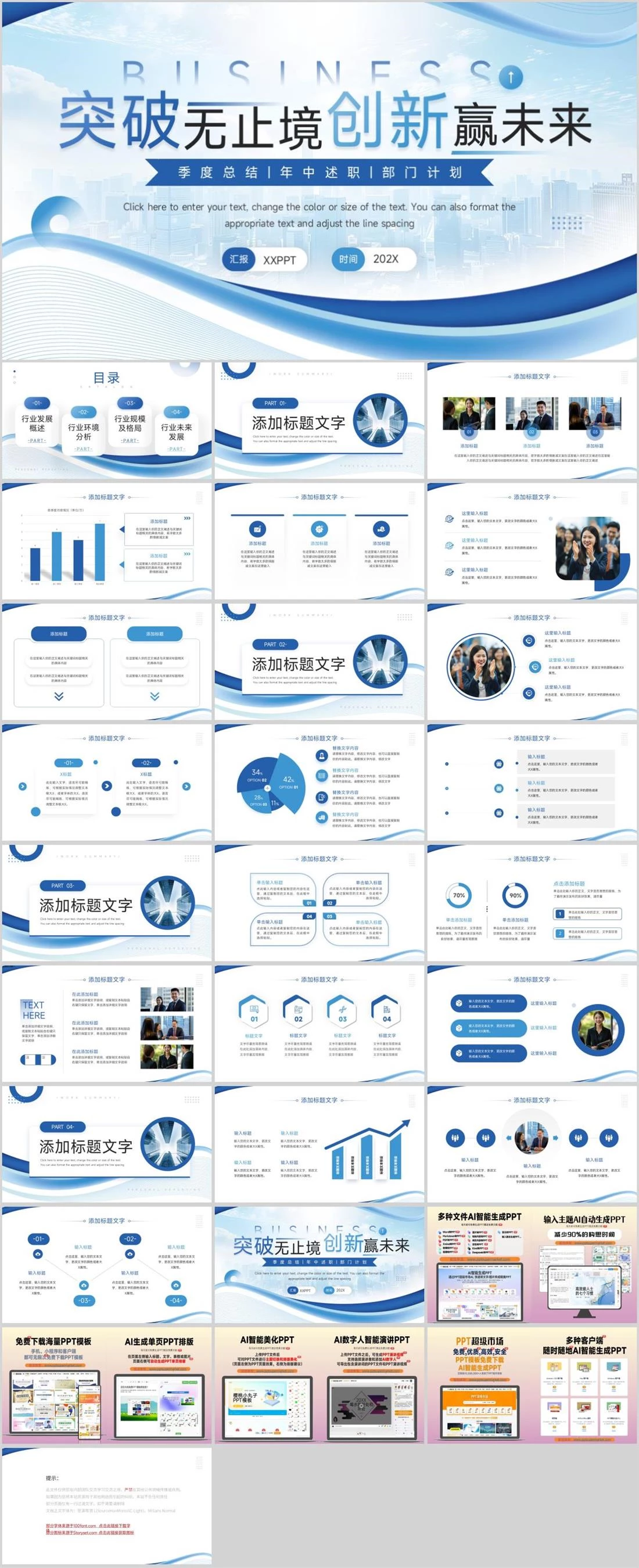 突破无止境创新赢未来季度总结|年中述职|部门计划Click here to enter your text, change the color or size of the text. You can also format the appropriate text and adjust the l蓝色商务,793,