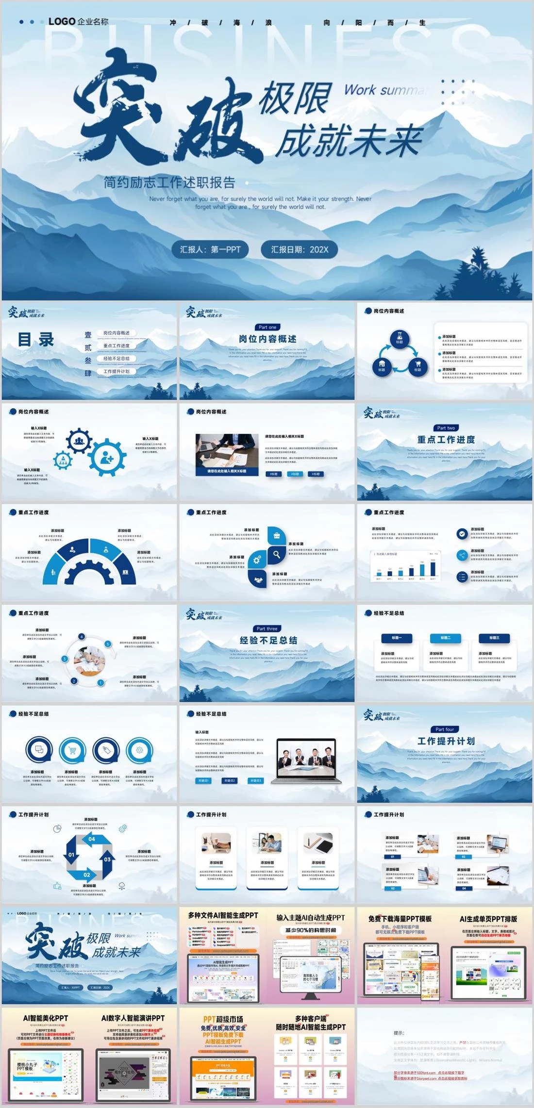 BUSINESSWork summary极限成就未来简约励志工作述职报告LOGO企业名称冲/破/海/浪 向/阳/而/生汇报人:第一PPT 汇报日期:202XNever forget what you are, for surely the world will not. Make it your蓝色商务,797,