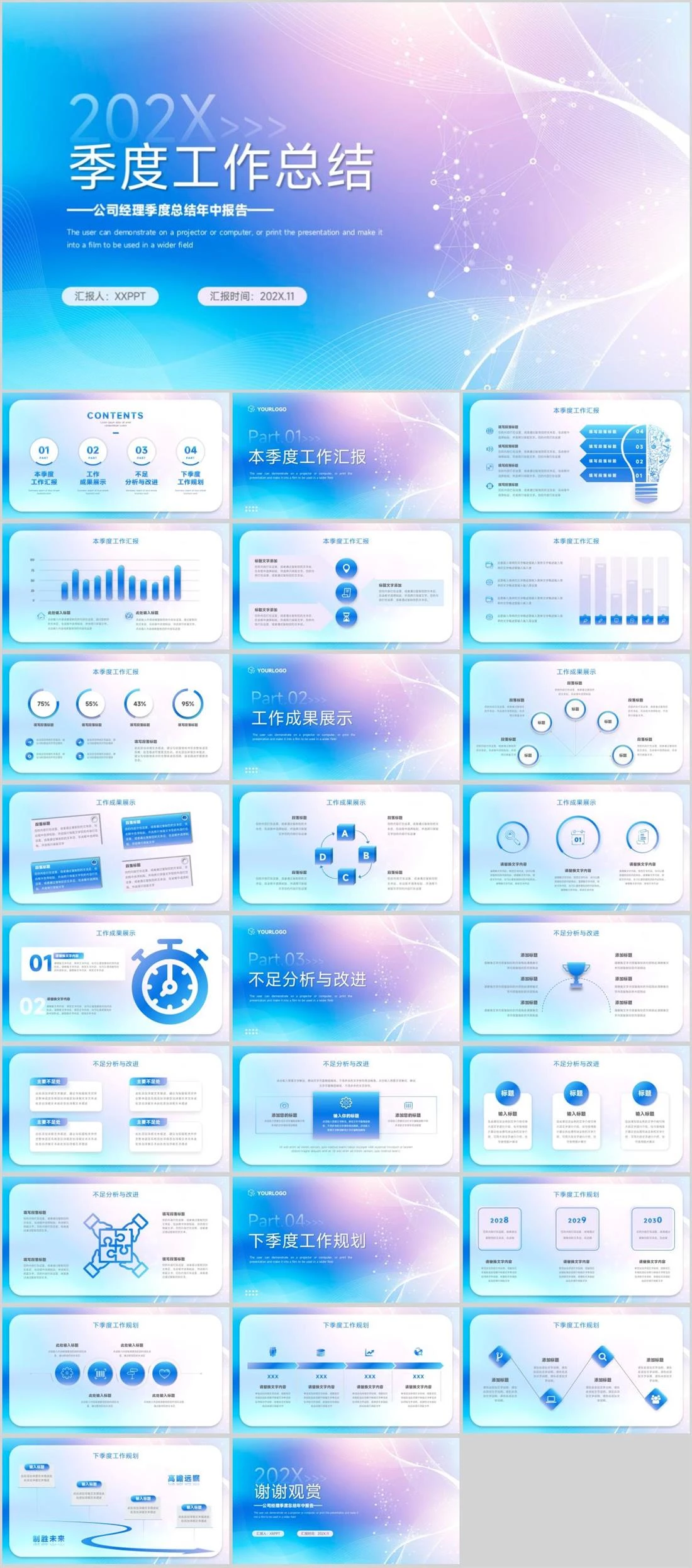 202X>>>季度工作总结——公司经理季度总结年中报告——汇报人:XXPPT 汇报时间:202X.11The user can demonstrate on a projector or computer, or print the presentation and make it into a fi多元创意,16,