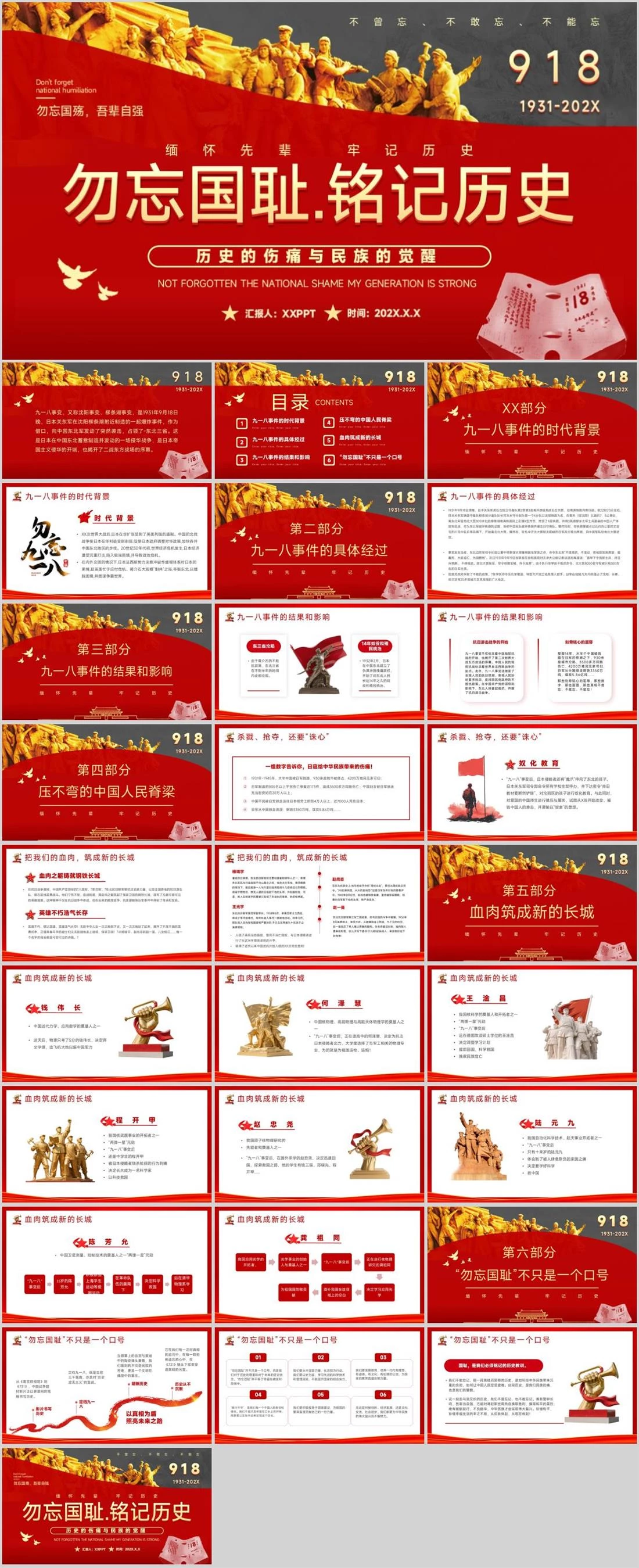 1931-202X勿忘国耻.铭记历史918勿忘国殇,吾辈自强Don't forget national humiliation历史的伤痛与民族的觉醒缅怀先辈 牢记历史NOT FORGOTTEN THE NATIONAL SHAME MY GENERATION IS STRONG汇报人:XXPP九一八事变,1627,