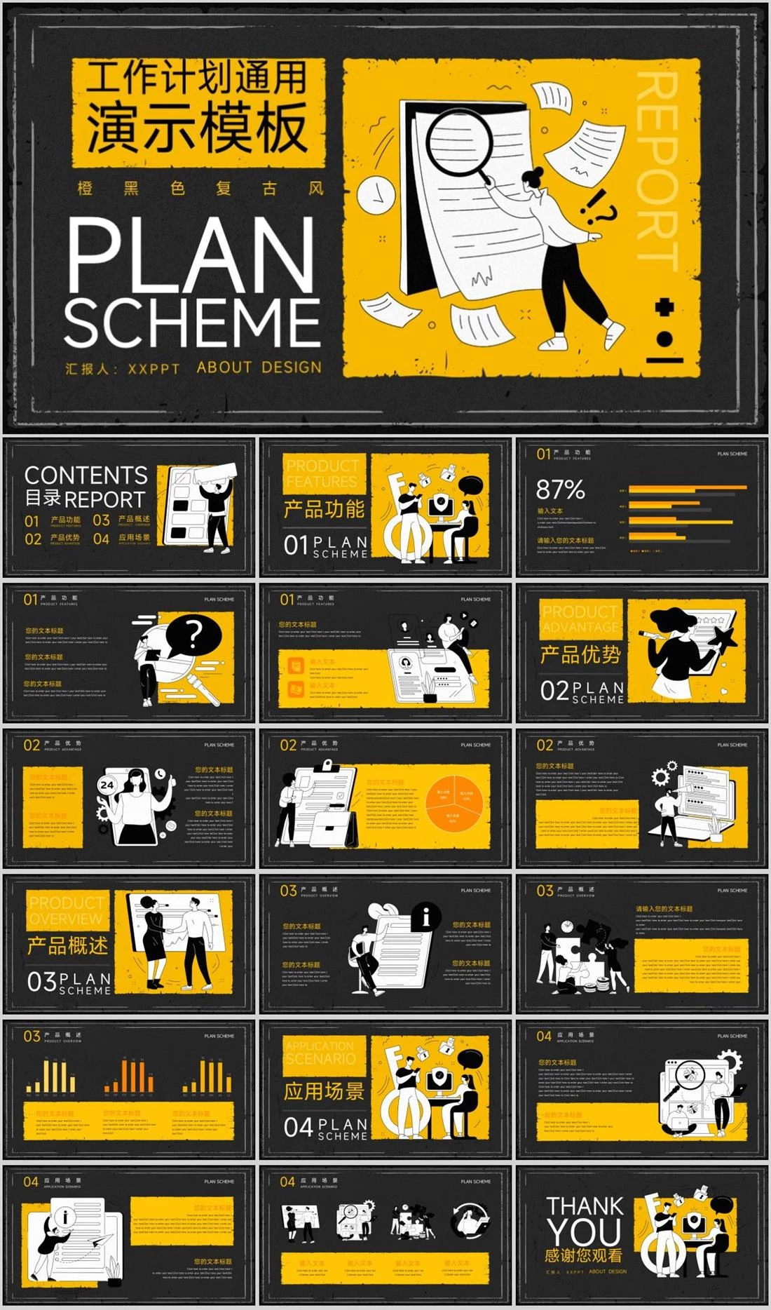 plan scheme橙黑色复古风汇报人:XXPPTAbout Design工作计划通用演示模板report卡通人物,23,
