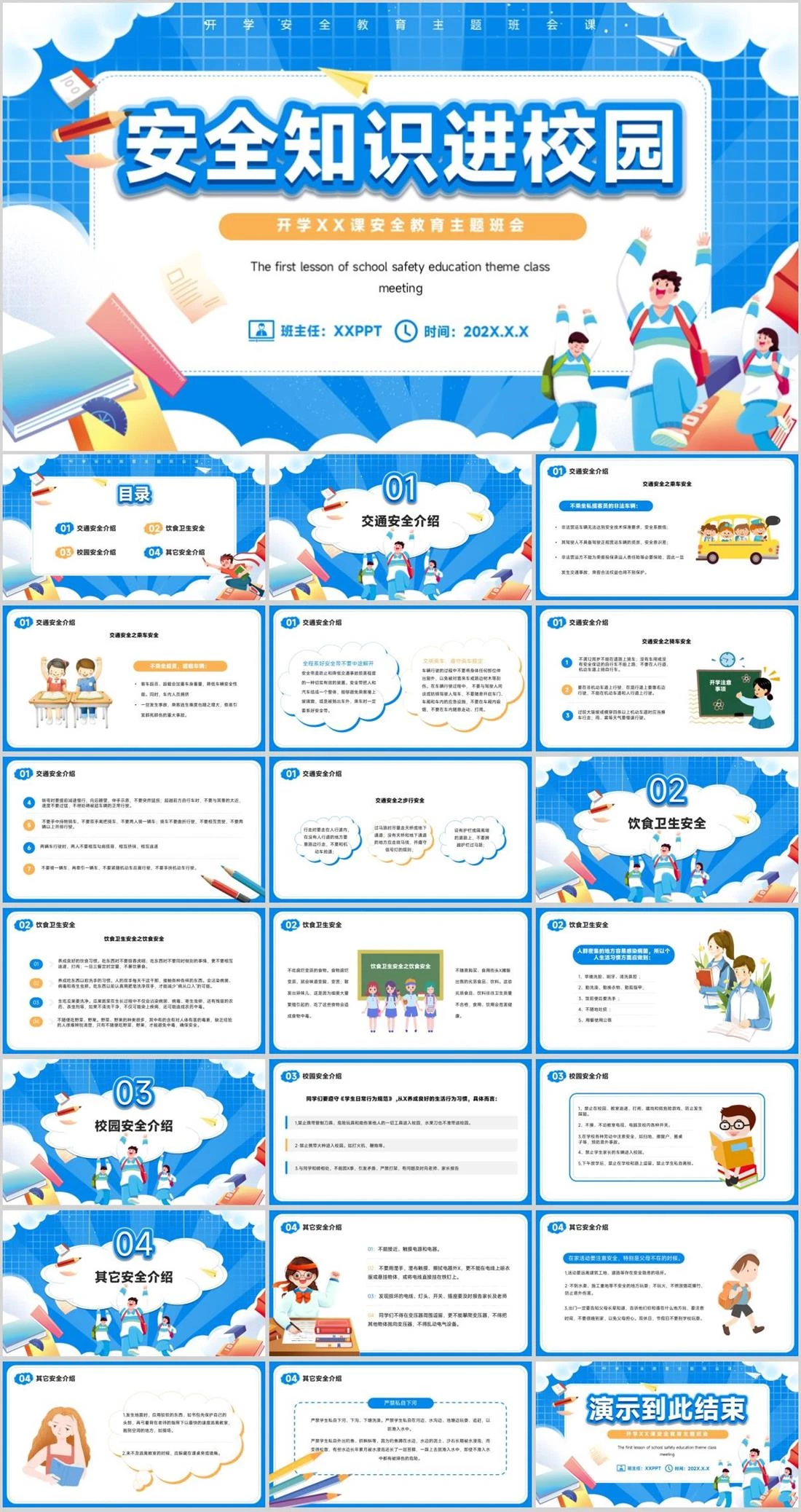 安全知识进校园安全知识进校园安全知识进校园开学XX课安全教育主题班会The first lesson of school safety education theme class meeting班主任:XXPPT时间:202X.X.X开学安全教育主题班会课安全知识进校园,