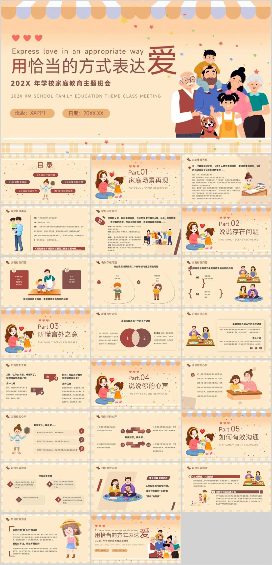 用恰当的方式表达爱202X 年学校家庭教育主题班会202X XM SCHOOL FAMILY EDUCATION THEME CLASS MEETING班级:XXPPT 日期:20XX.XXExpress love in an appropriate way家庭教育讲座,718,