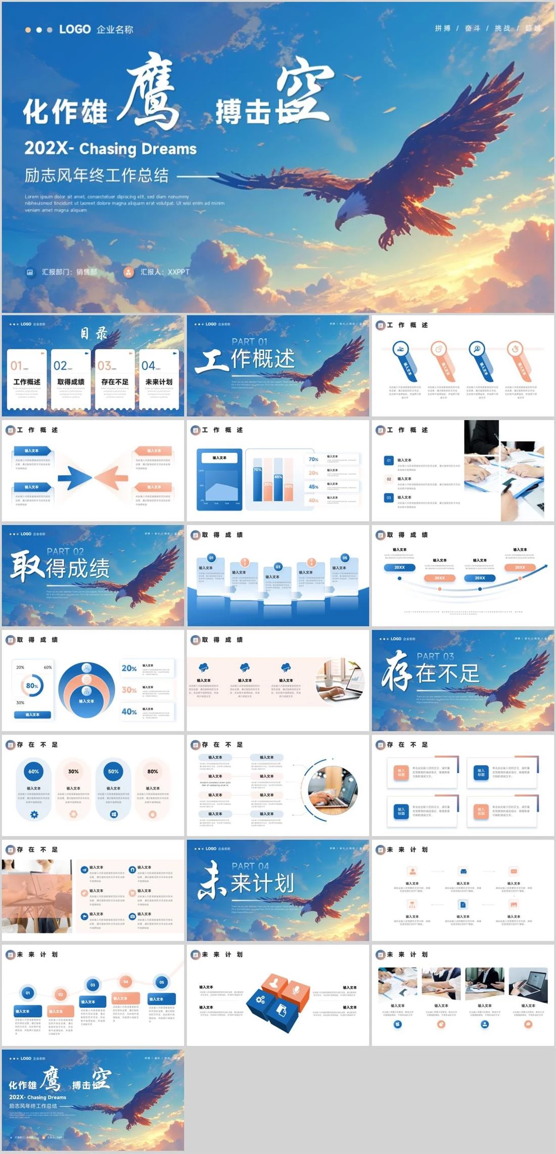 拼搏 / 奋斗 / 挑战 / 超越202X- Chasing Dreams化作雄 搏击长励志风年终工作总结LOGO企业名称汇报部门:销售部汇报人:XXPPT Lorem ipsum dolor sit amet, consectetuer dipiscing elit, sed d工作总结,2291,