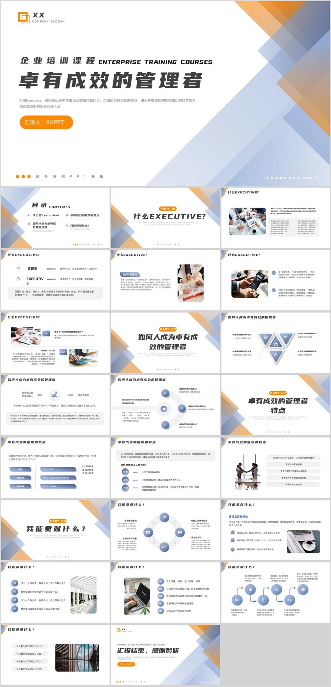 卓有成效的管理者企业培训课程所谓Executive,是指在组织中凭借自己的职位和知识,对组织负有贡献的责任,进而能够实质的影响组织的经营能力和达成成果的所有经理人员TANGFENG/PPTXXCOMPANY SLOGAN商务系列PPT模板汇报人:XXPPTENTERPRISE TRAINING CO企业培训,386,
