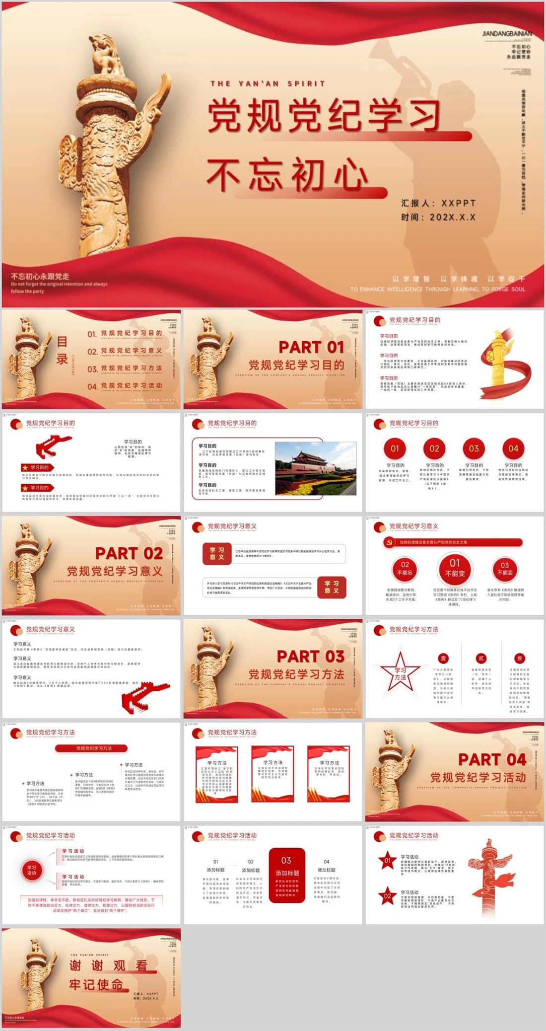党规党纪学习不忘初心THE YAN'AN SPIRIT以学增智 以学铸魂 以学促干TO ENHANCE INTELLIGENCE THROUGH LEARNING, TO FORGE SOUL汇报人:XXPPT 时间:202X.X.X党规党纪,