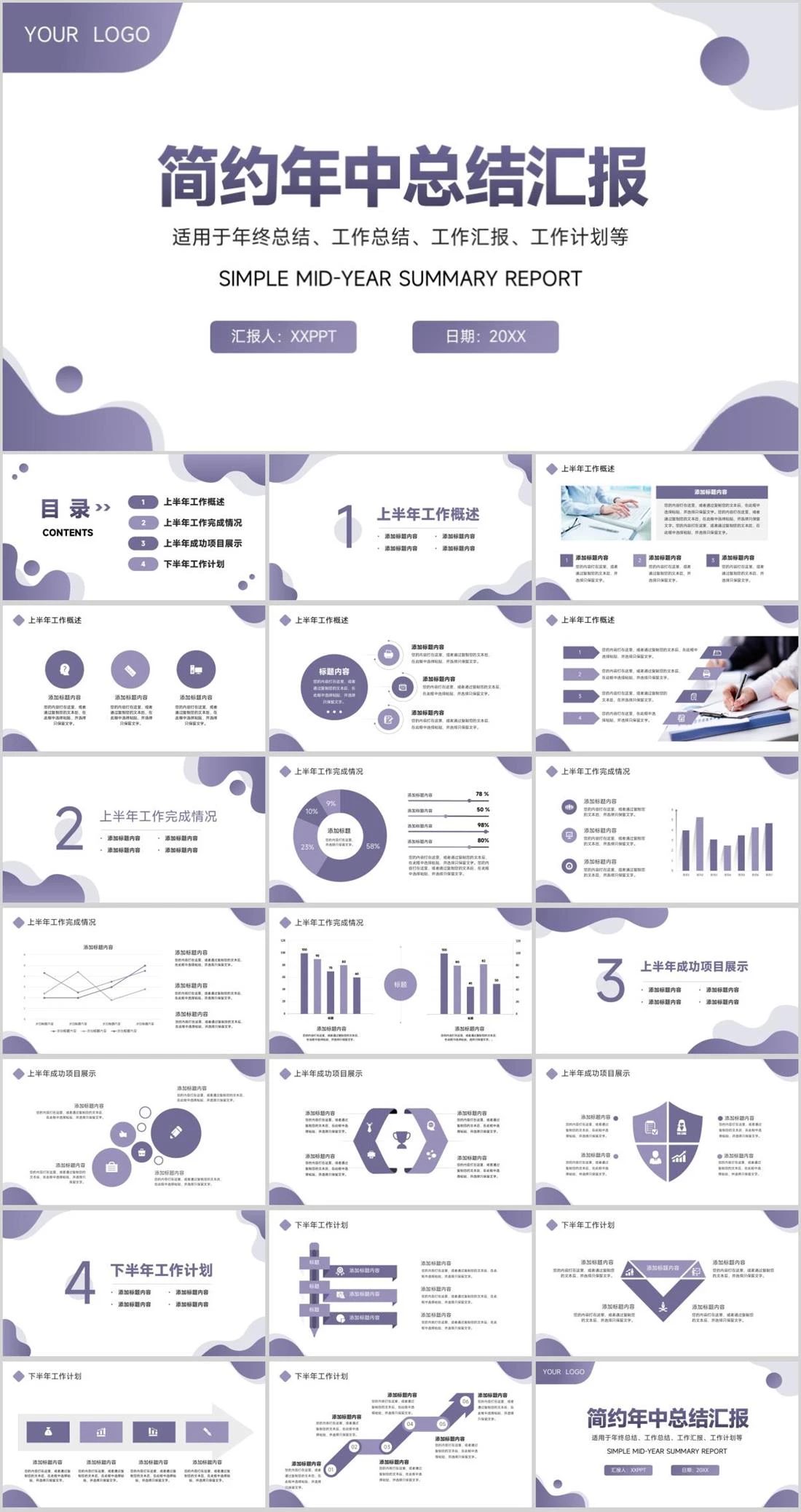 YOUR LOGO简约年中总结汇报适用于年终总结、工作总结、工作汇报、工作计划等Simple mid-year summary report汇报人:XXPPT日期:20XX商务汇报,1160,