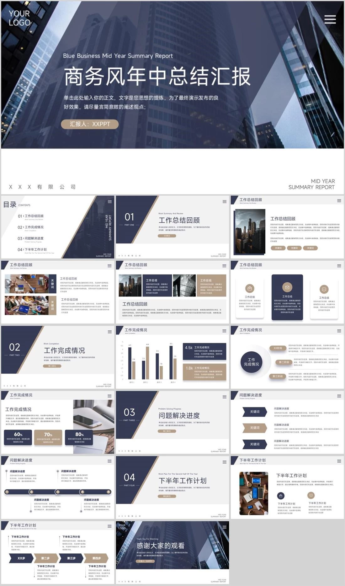 YOURLOGO商务风年中总结汇报Blue Business Mid Year Summary Report单击此处输入你的正文,文字是您思想的提炼,为了最终演示发布的良好效果,请尽量言简意赅的阐述观点;MID YEAR SUMMARY REPORTXXX有限公司汇报人:XXPPT商务汇报,1179,