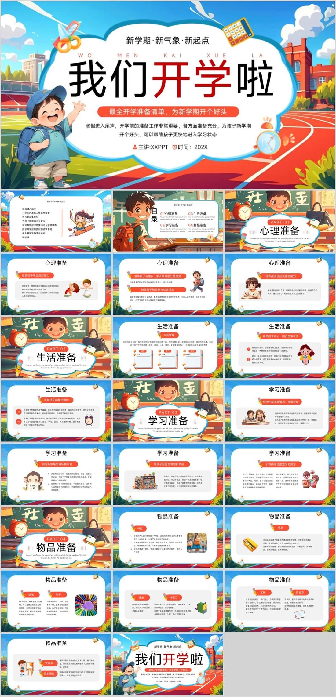 新学期·新气象·新起点最全开学准备清单,为新学期开个好头我们开学啦WO MEN KAI XUE LA寒假进入尾声,开学前的准备工作非常重要,各方面准备充分,为孩子新学期开个好头,可以帮助孩子更快地进入学习状态主讲:XXPPT时间:202X新学期,606,