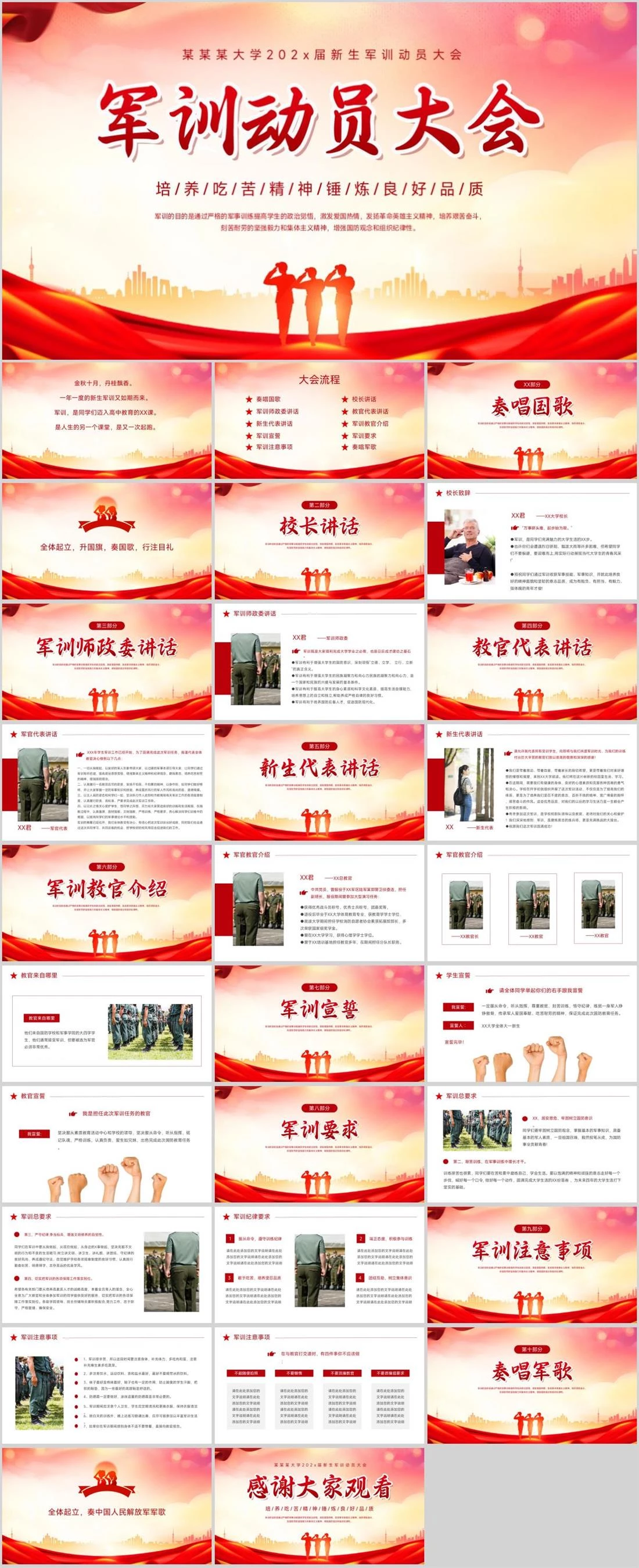 某某某大学202x届新生军训动员大会培/养/吃/苦/精/神/锤/炼/良/好/品/质军训的目的是通过严格的军事训练提高学生的政治觉悟,激发爱国热情,发扬革命英雄主义精神,培养艰苦奋斗,刻苦耐劳的坚强毅力和集体主义精神,增强国防观念和组织纪律性。新生军训,965,