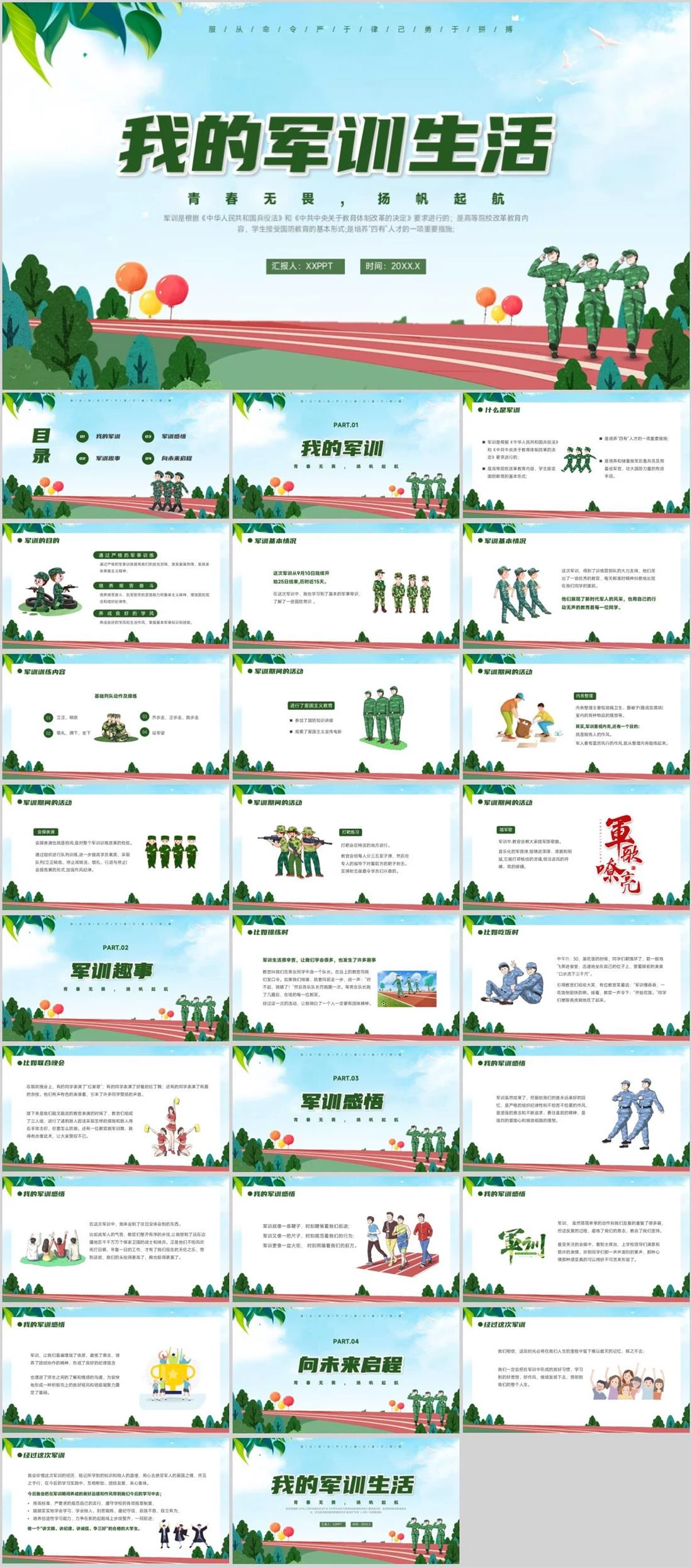 我的军训生活我的军训生活青春无畏,扬帆起航军训是根据《中华人民共和国兵役法》和《中共中央关于教育体制改革的决定》要求进行的;是高等院校改革教育内容,学生接受国防教育的基本形式;是培养“四有”人才的一项重要措施;汇报人:XXPPT时间:20XX.X服/从/命/令/严/于/律/己/勇/于/拼/搏新生军训,966,